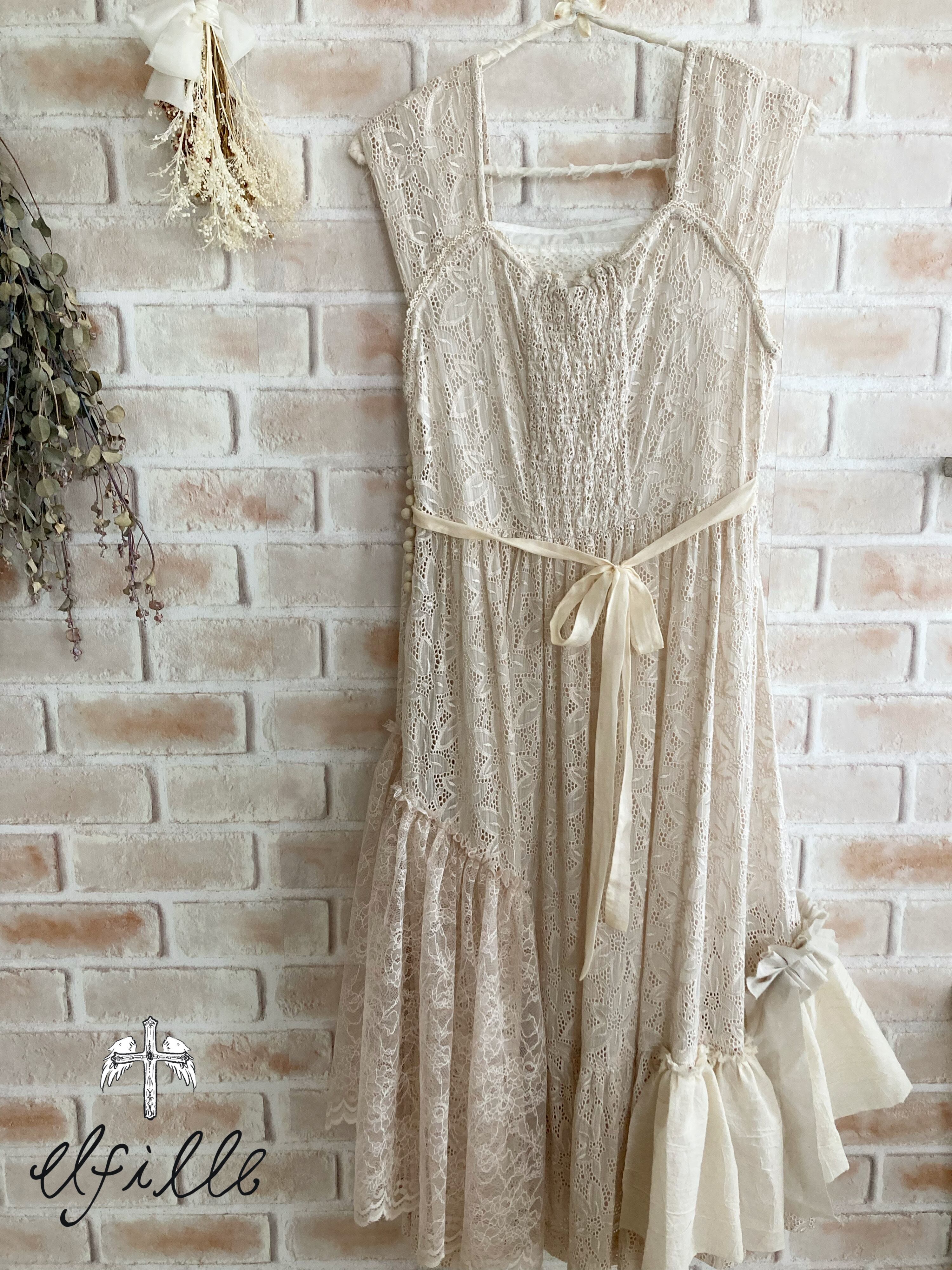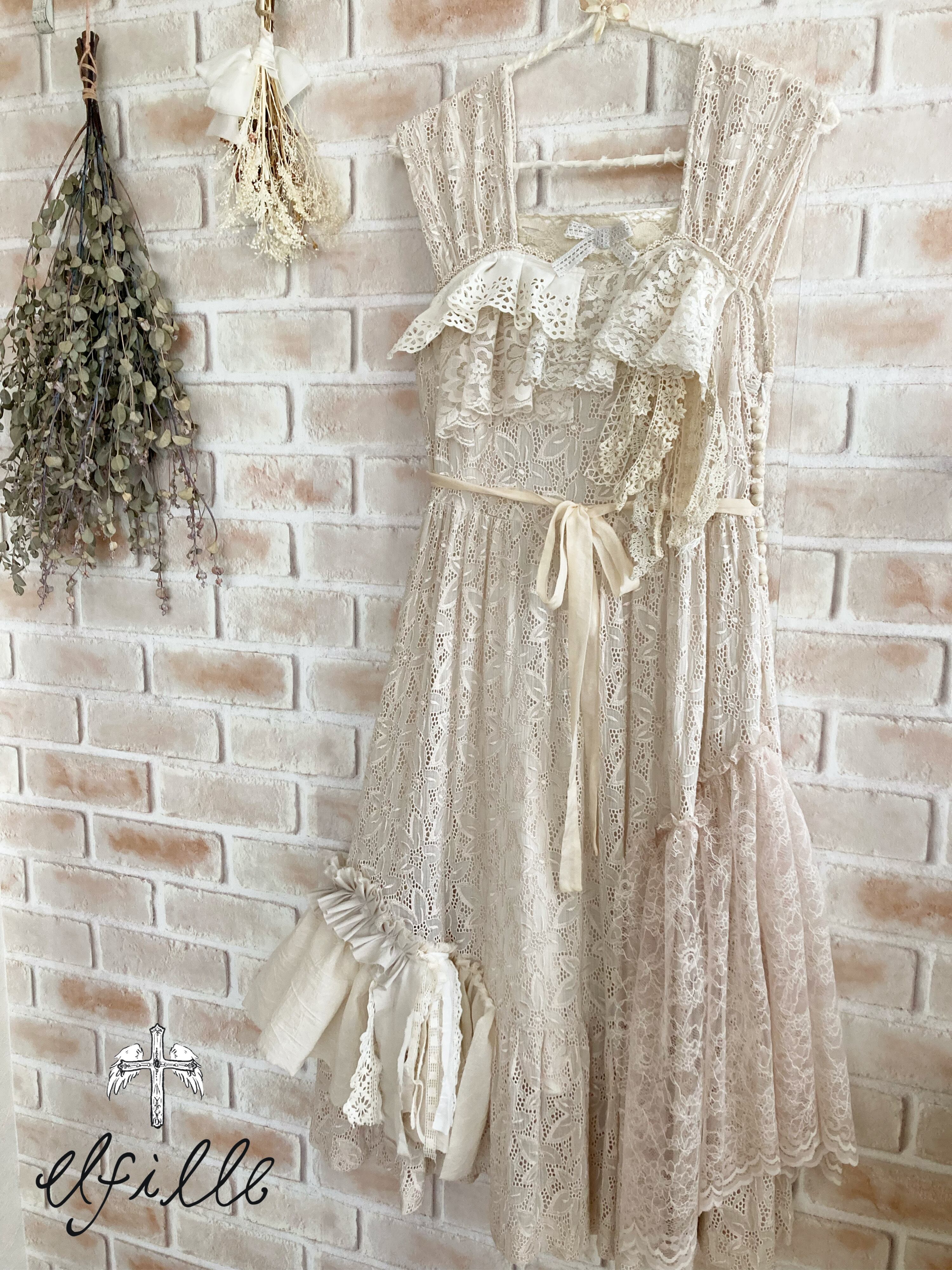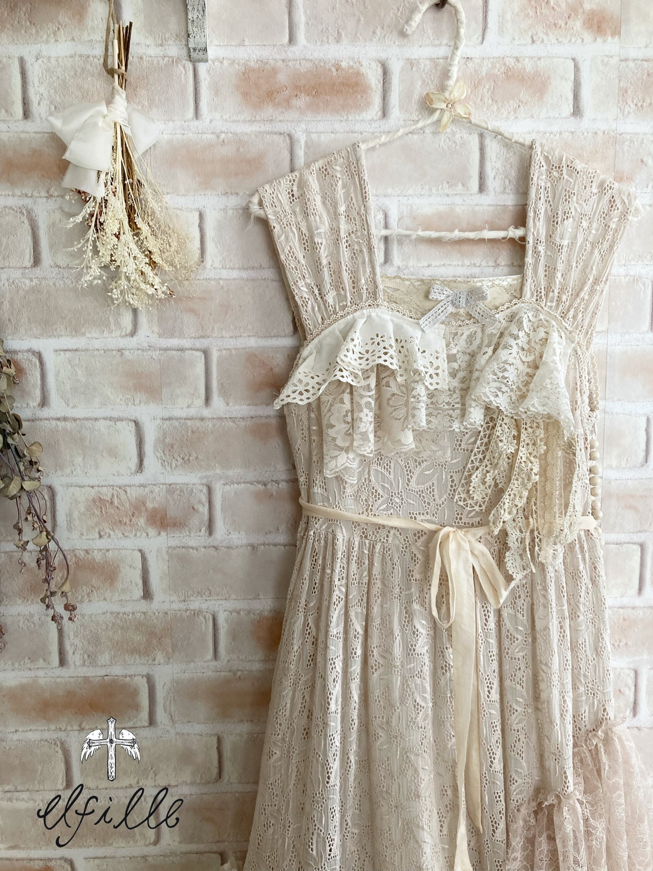 アンティークレースやフリルを縫い付けてデザインした一点もののワンピースです。