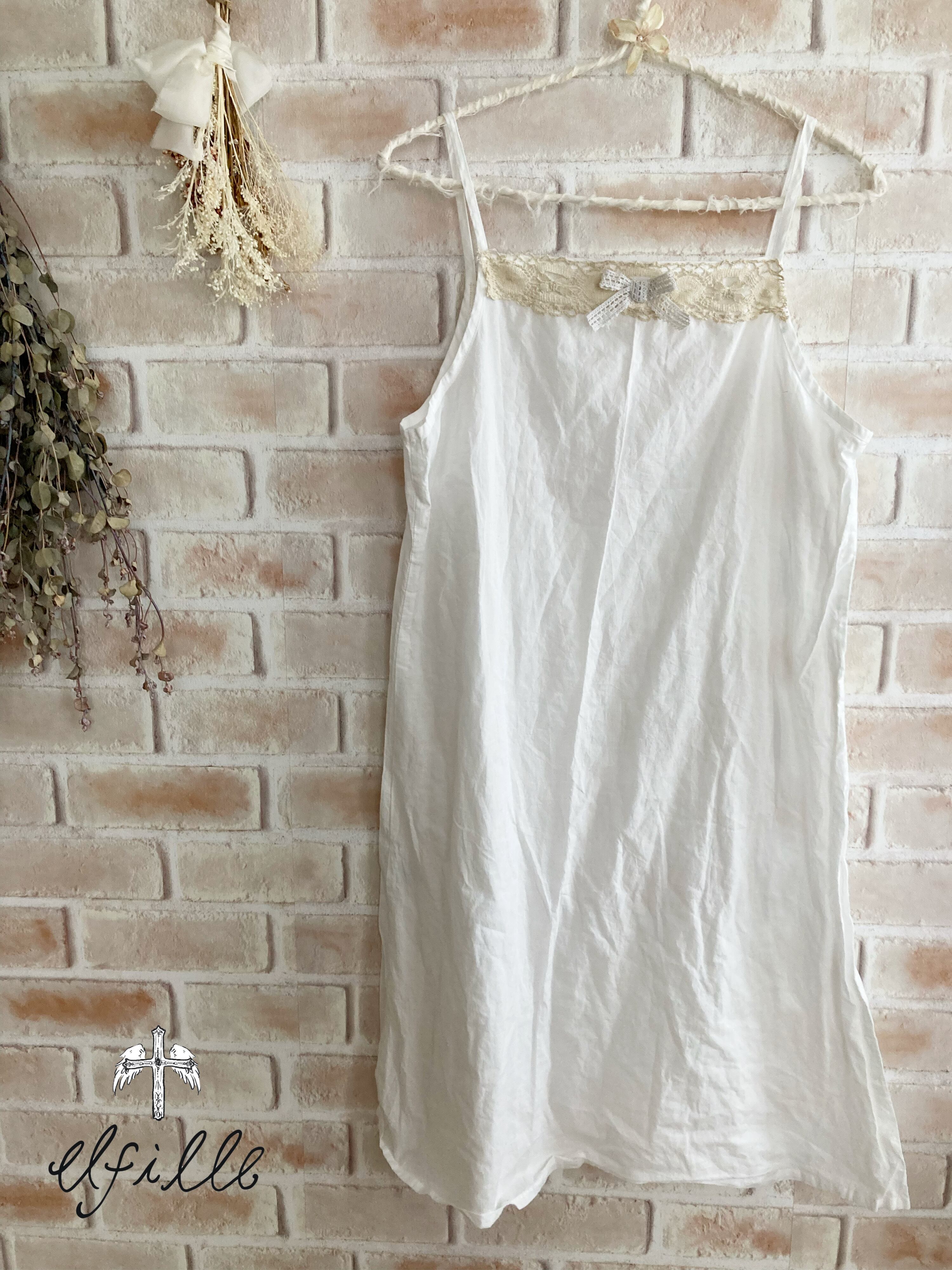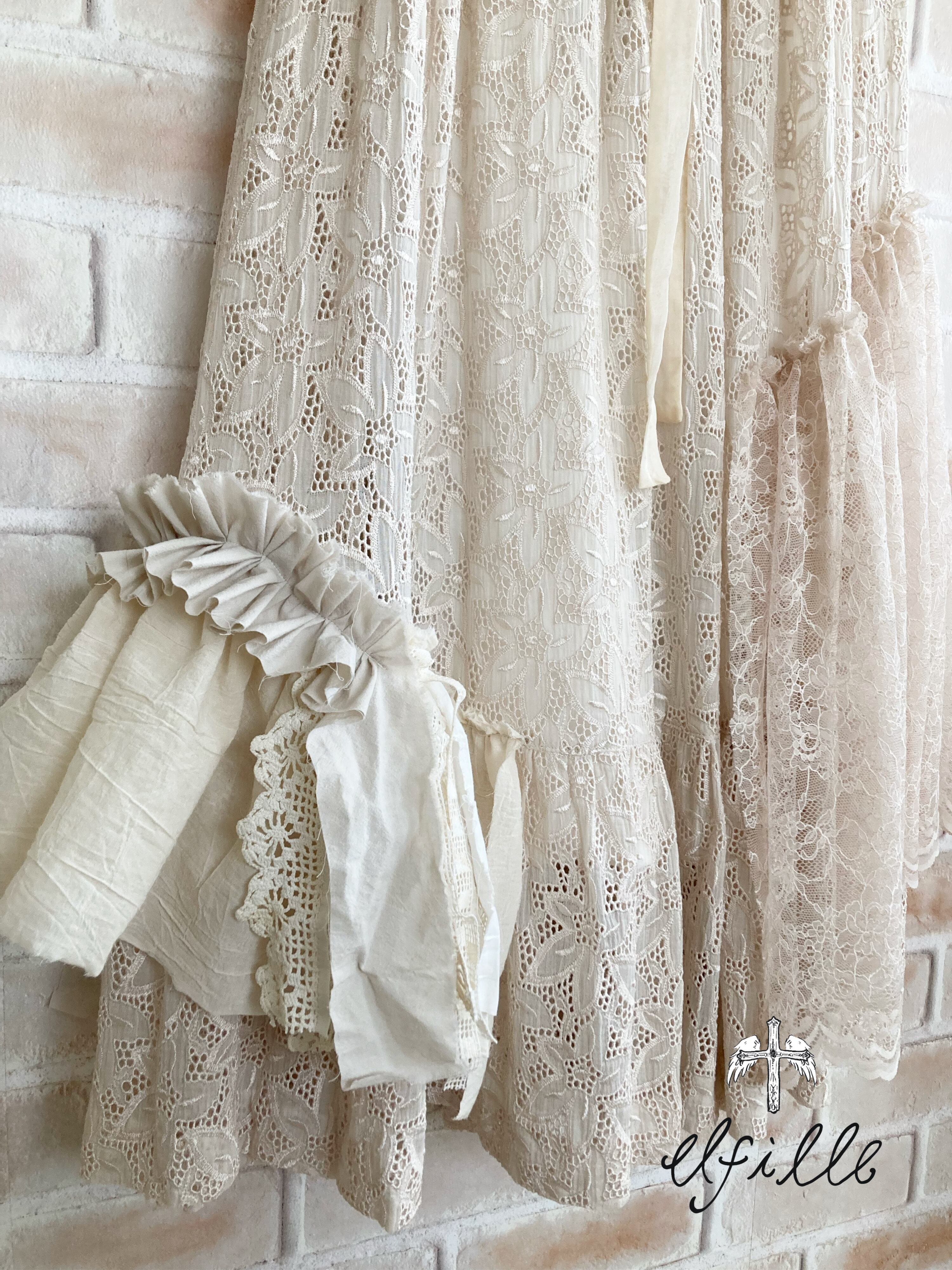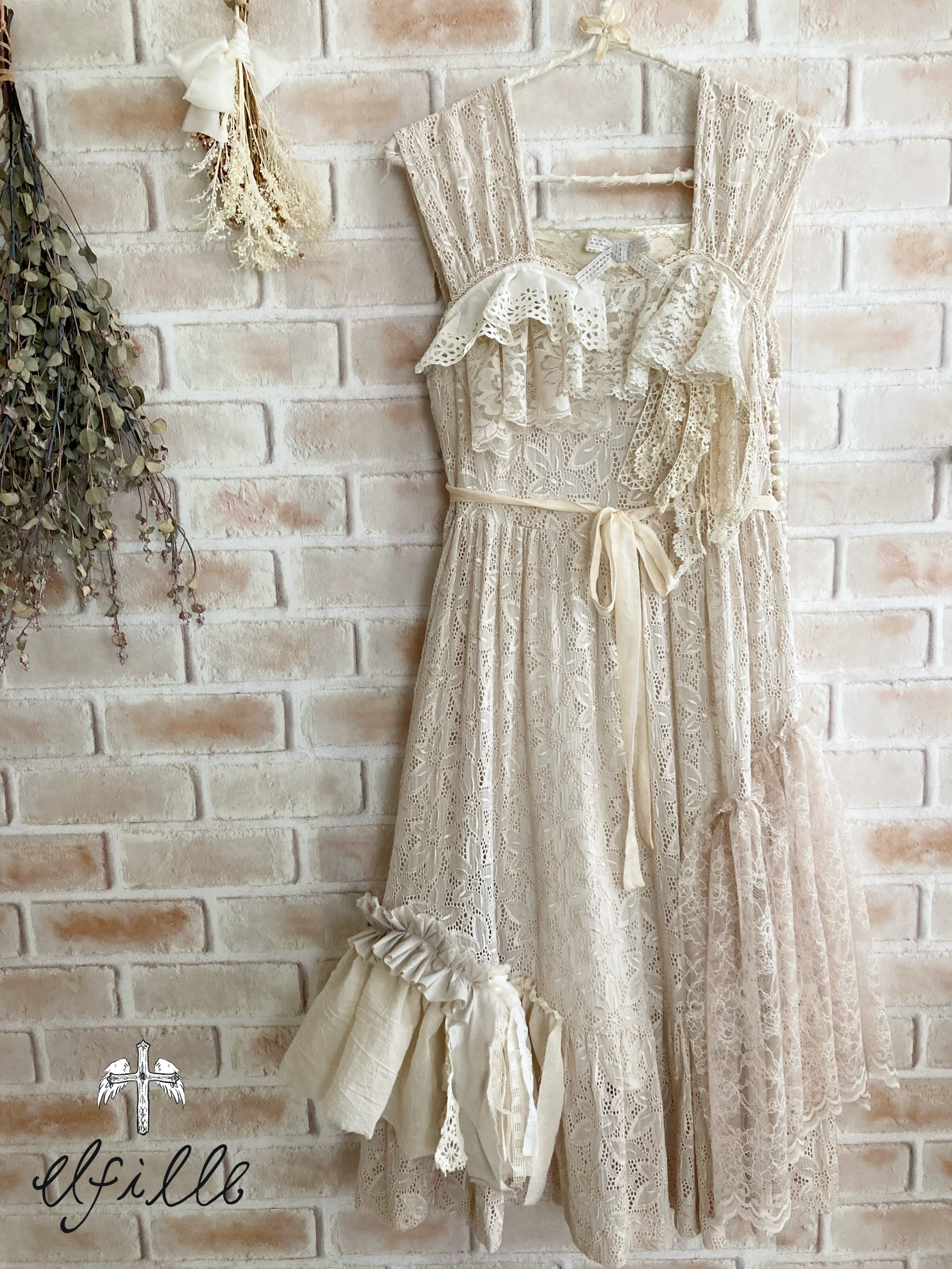 アンティークレースやフリルを縫い付けてデザインした一点もののワンピースです。
