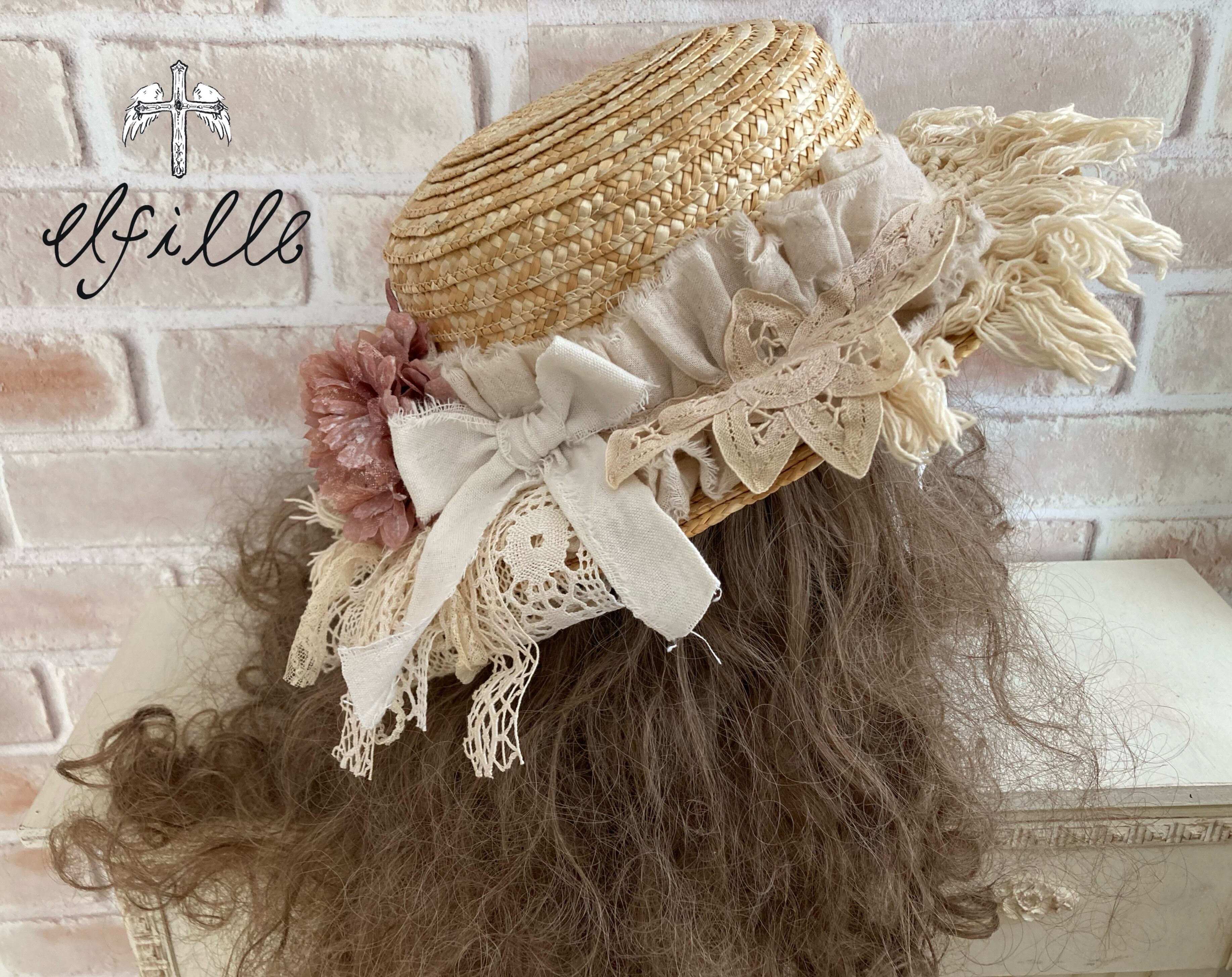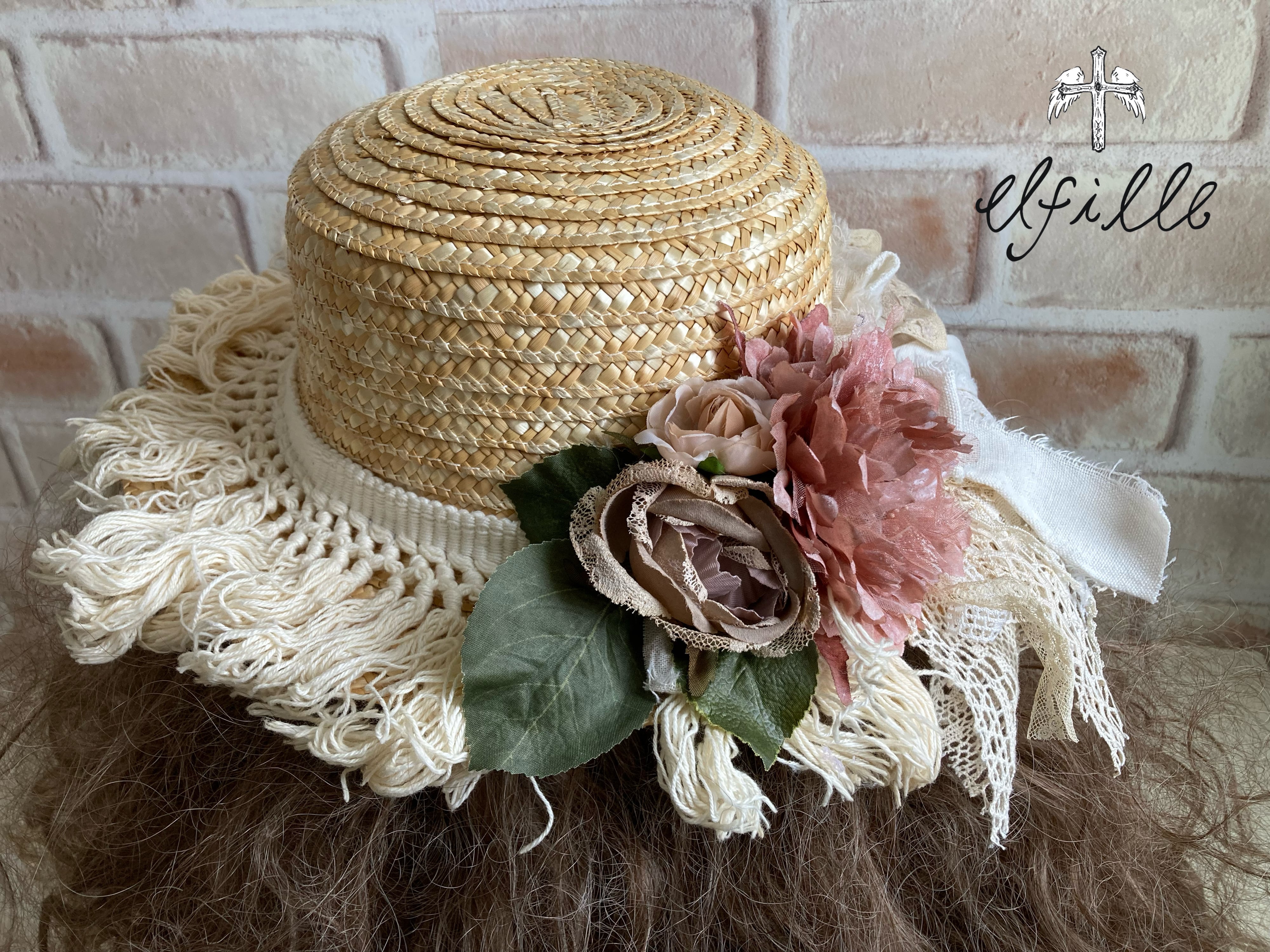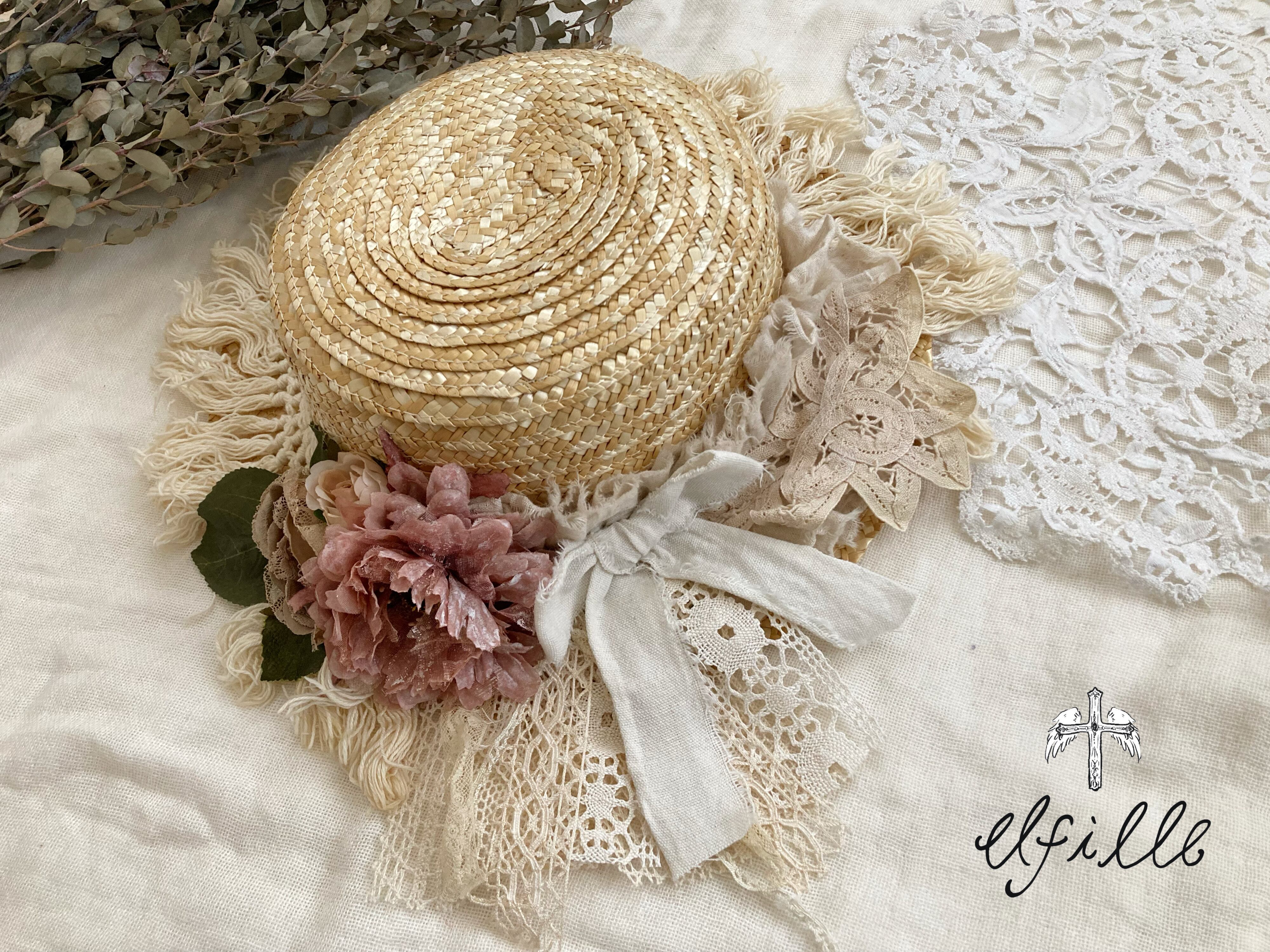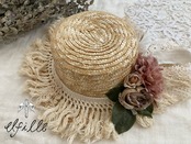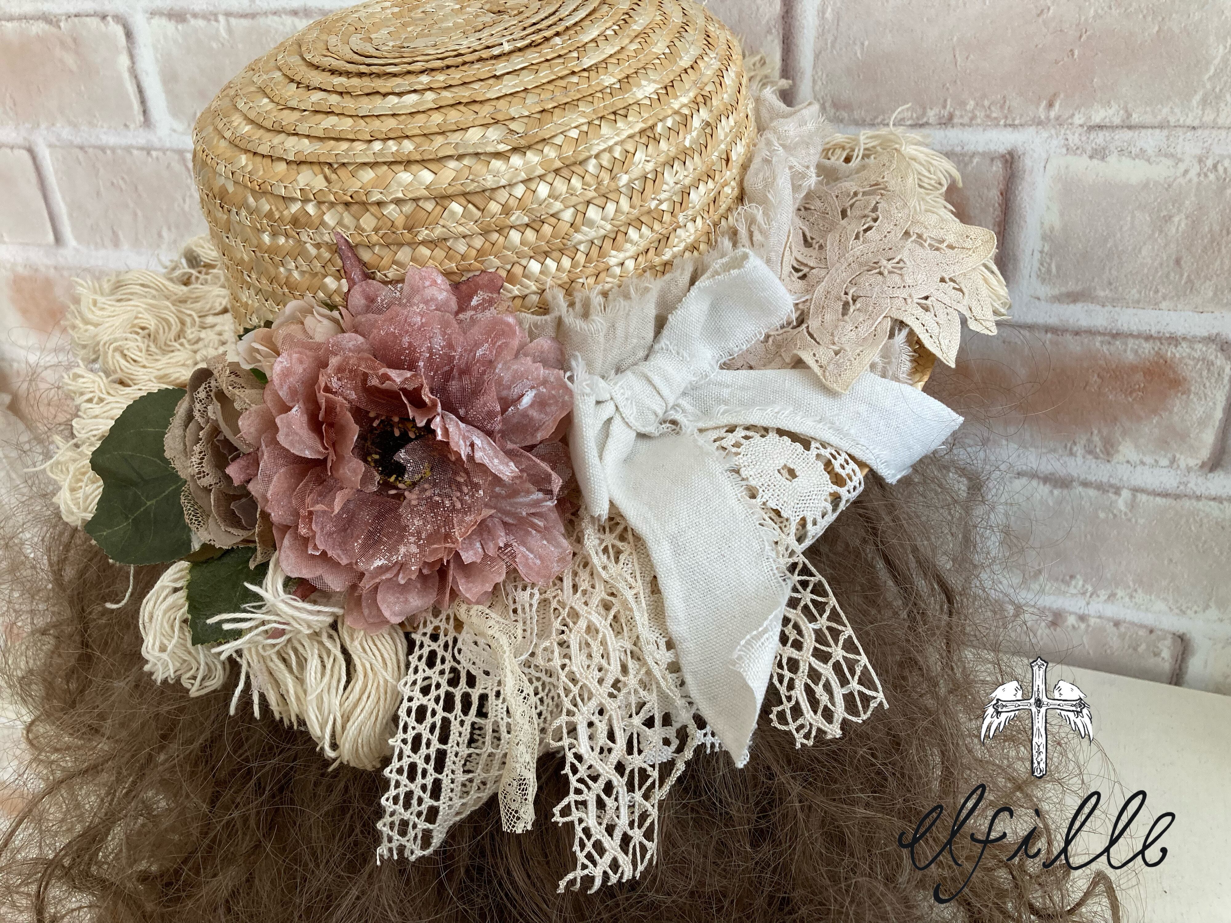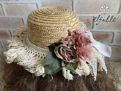 レディースサイズの麦わら帽子をアンティークレースやアーティシャルフラワーでリメイクしました。