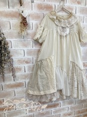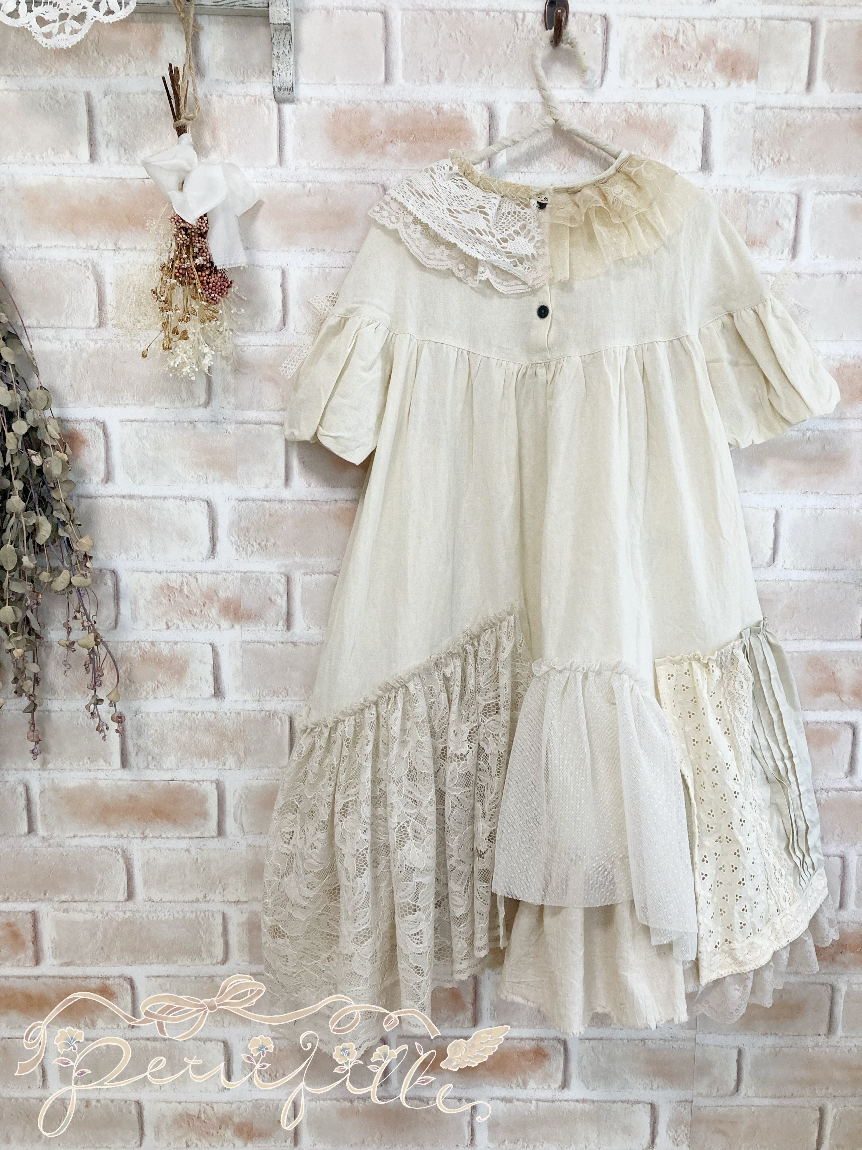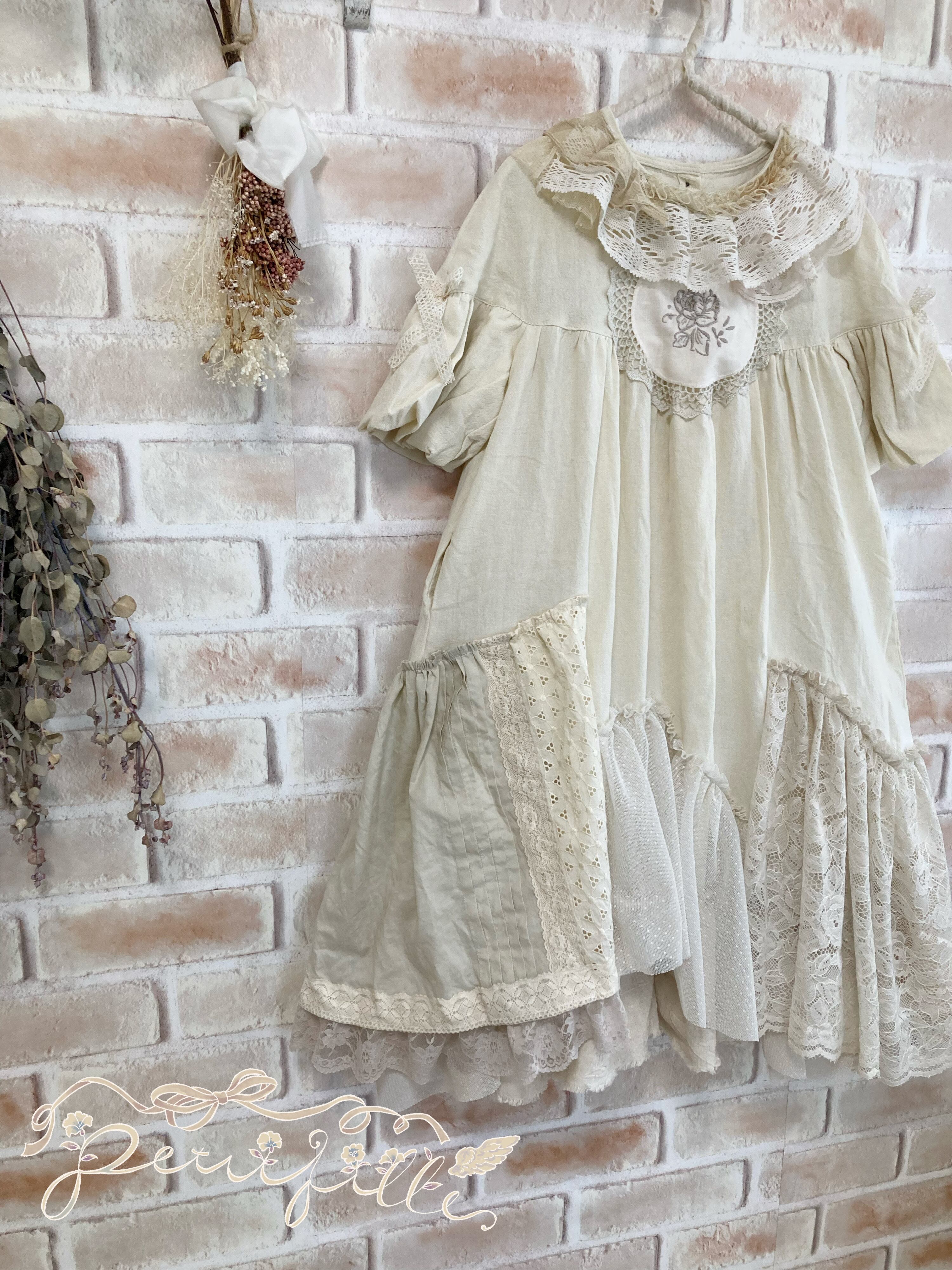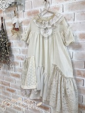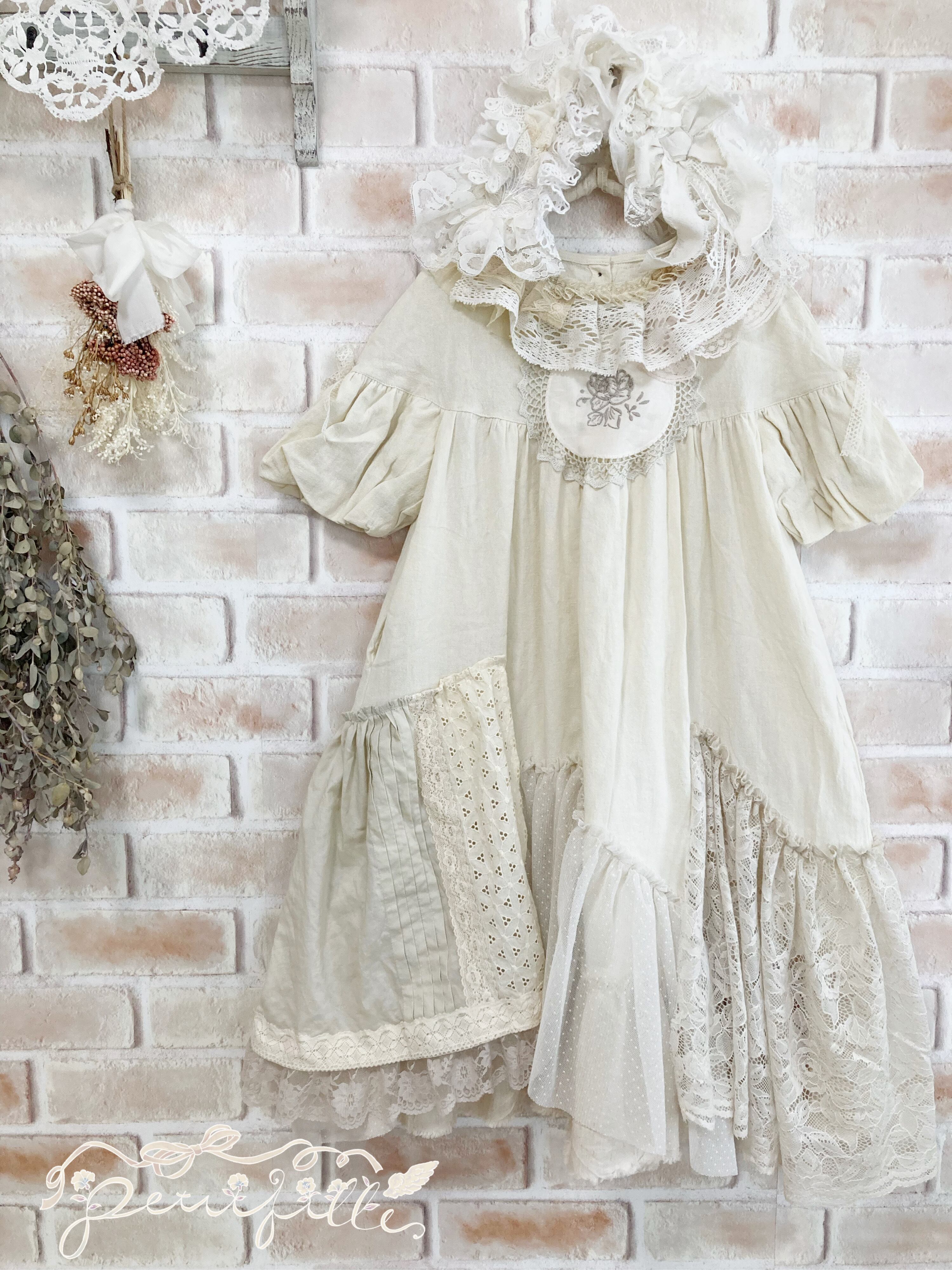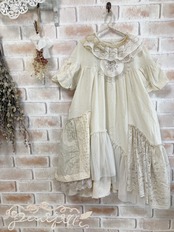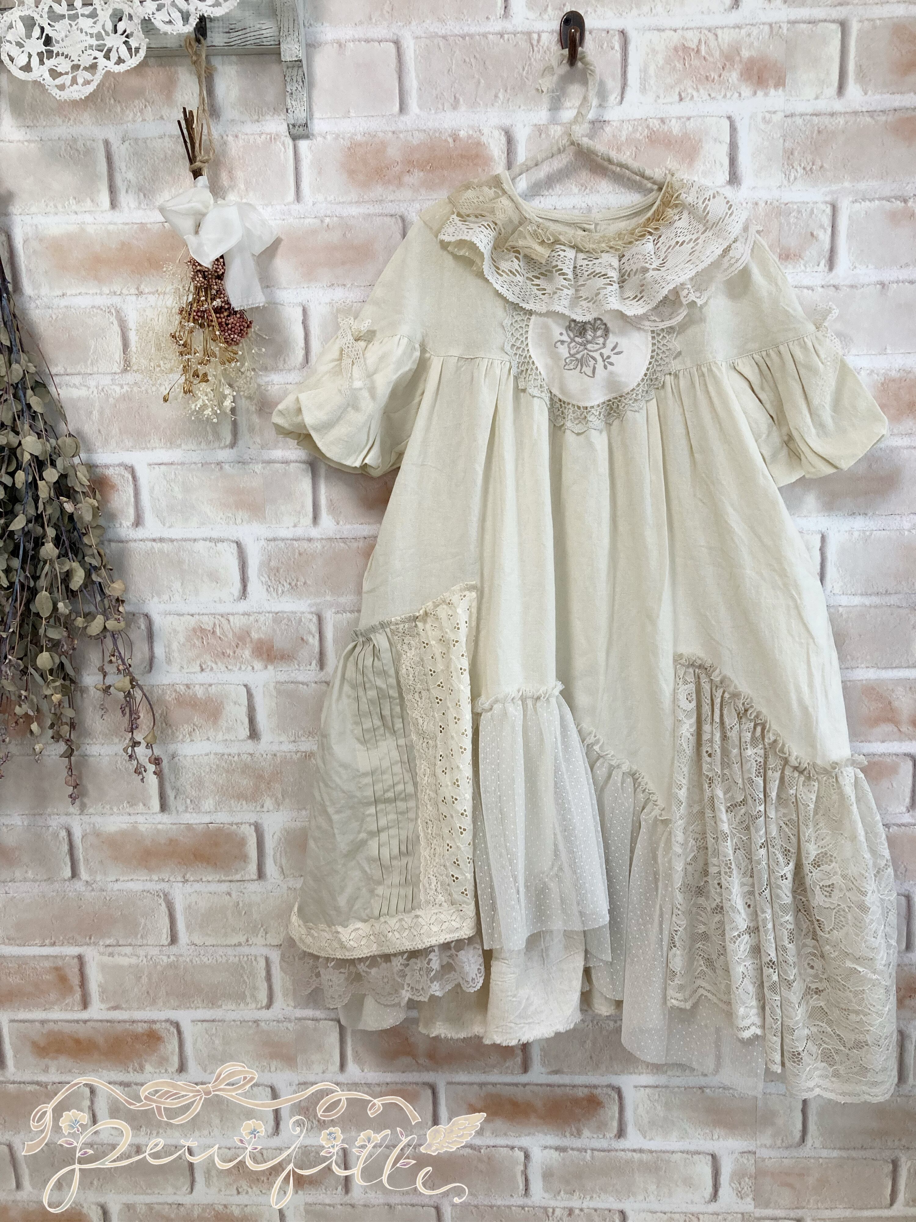 解体した古着やレース生地、アンティークレースなどを使用しリメイクした一点物のデザインワンピース。