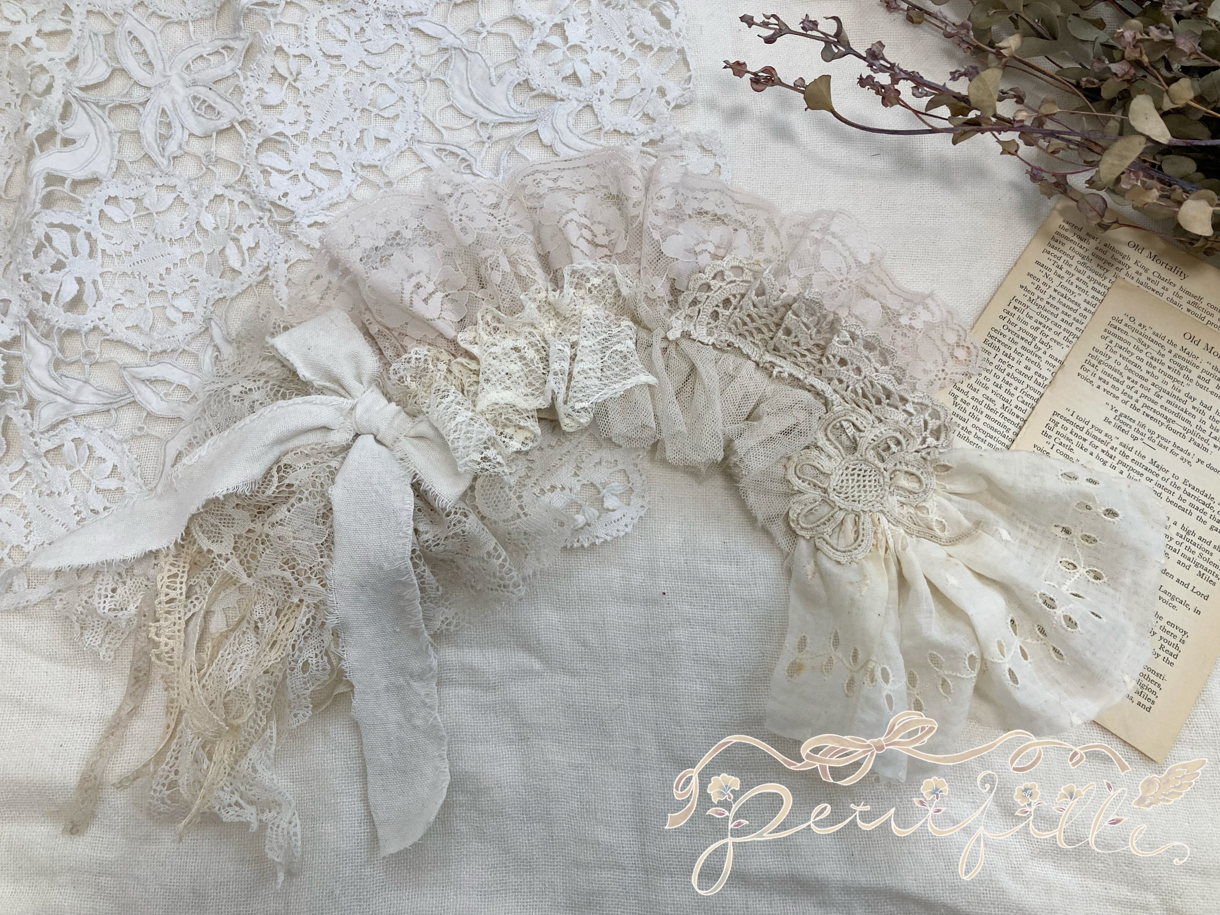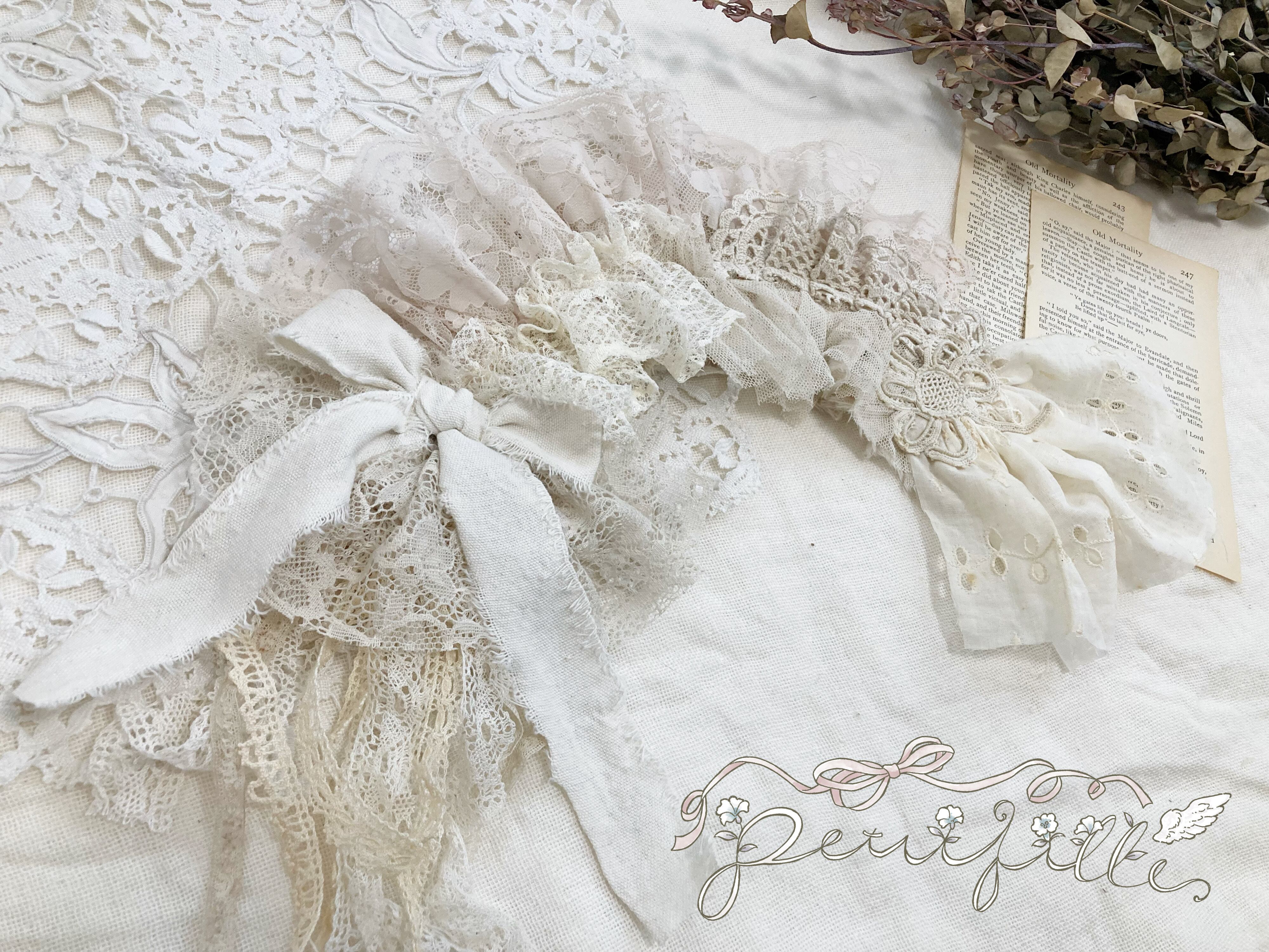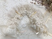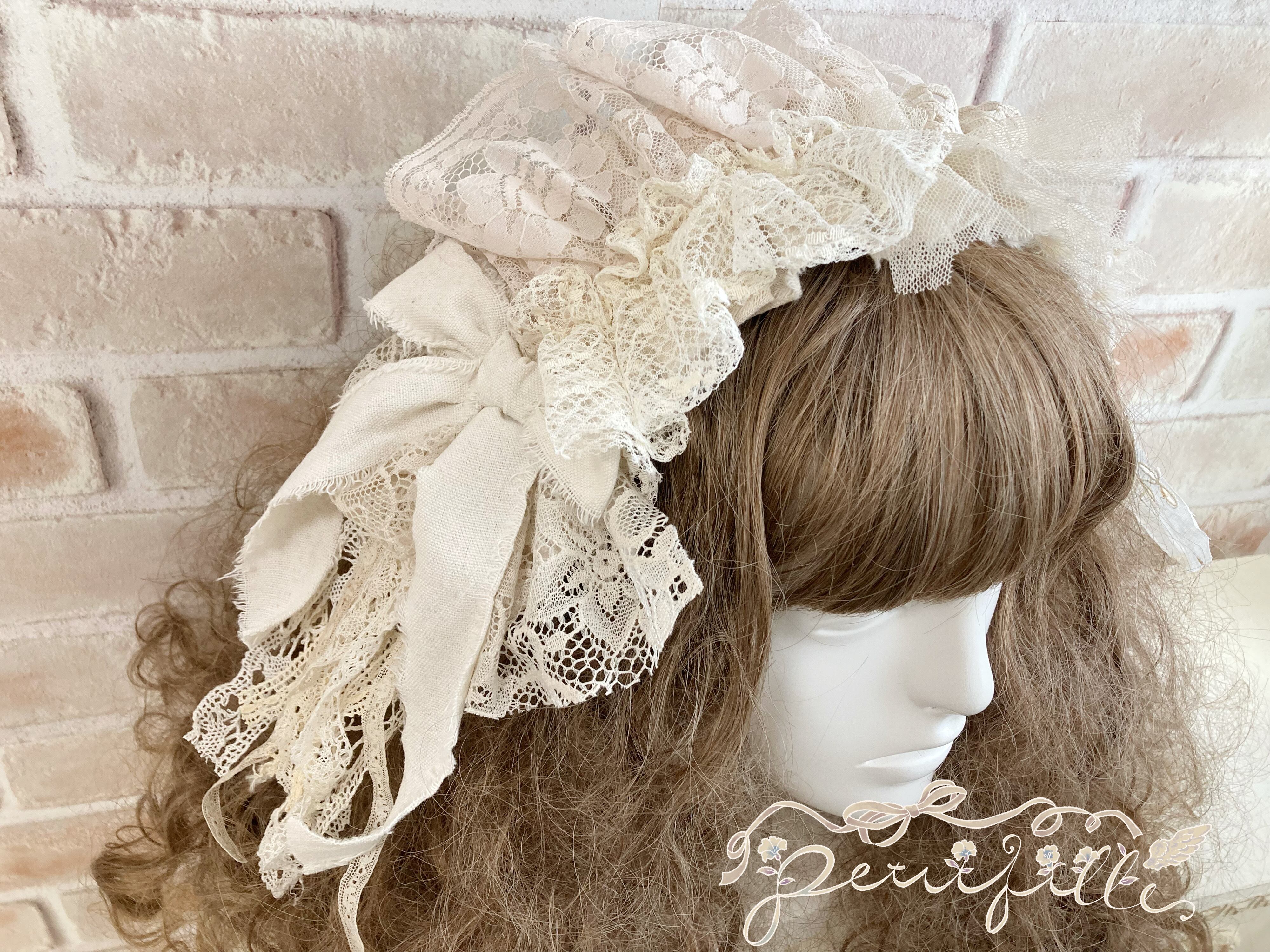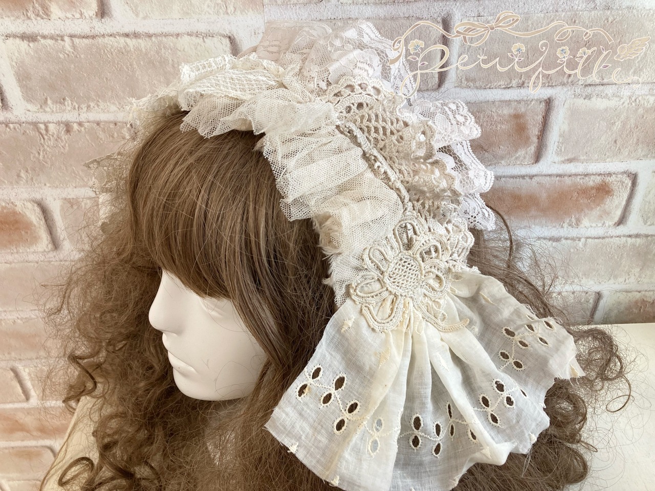 沢山のアンティークレースや現行レースを重ね、一点もののデザインのボリューム感のあるヘッドドレスです。