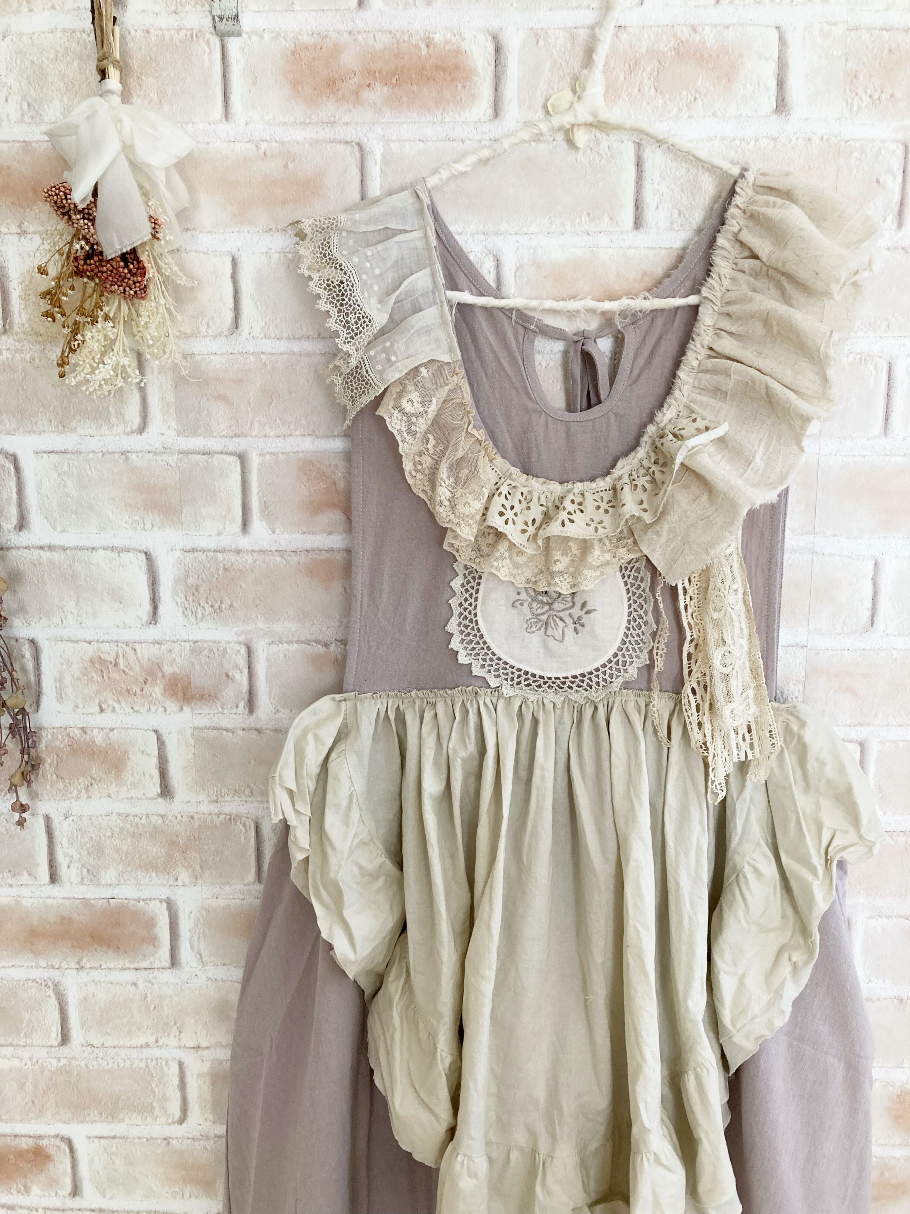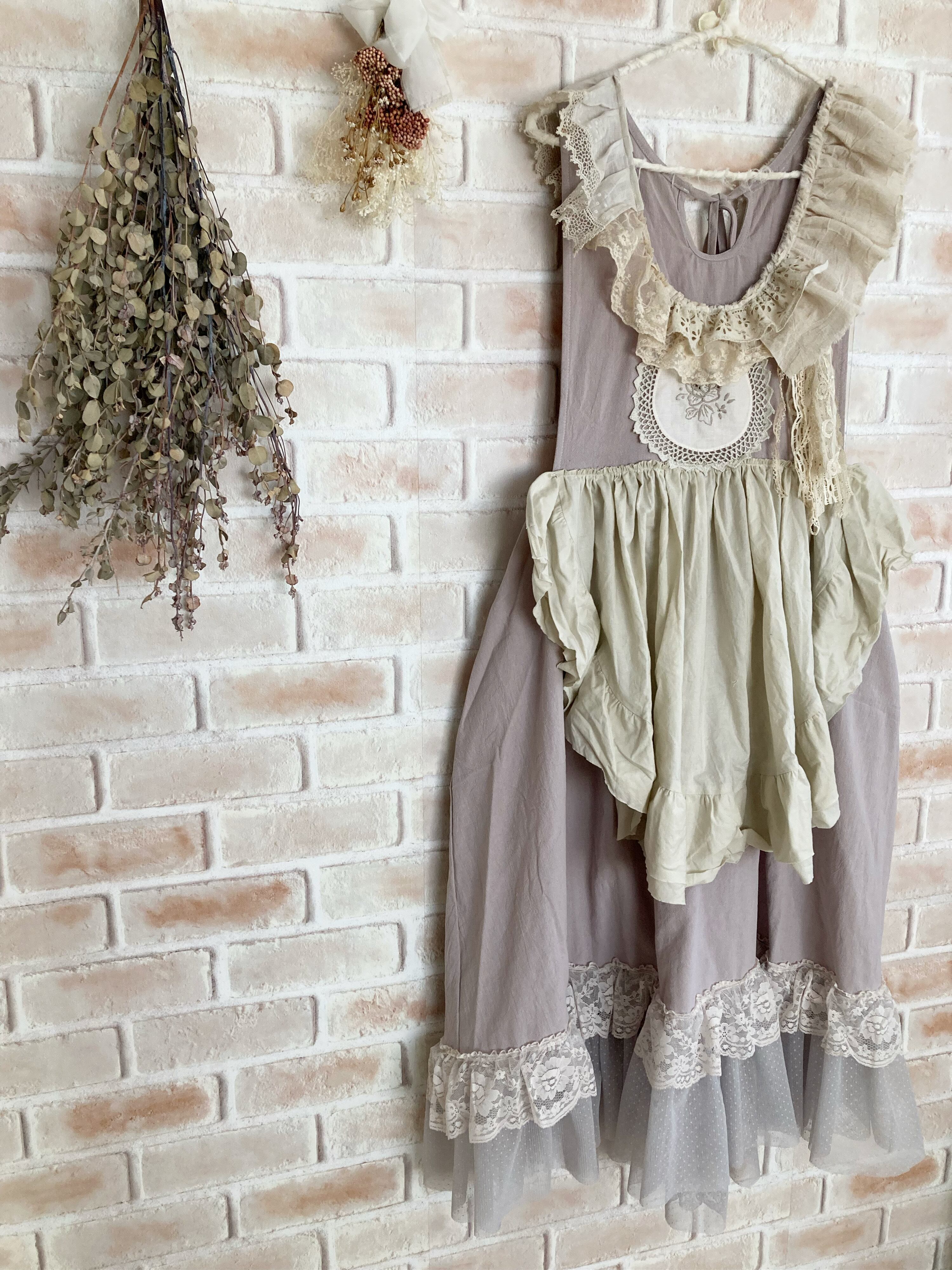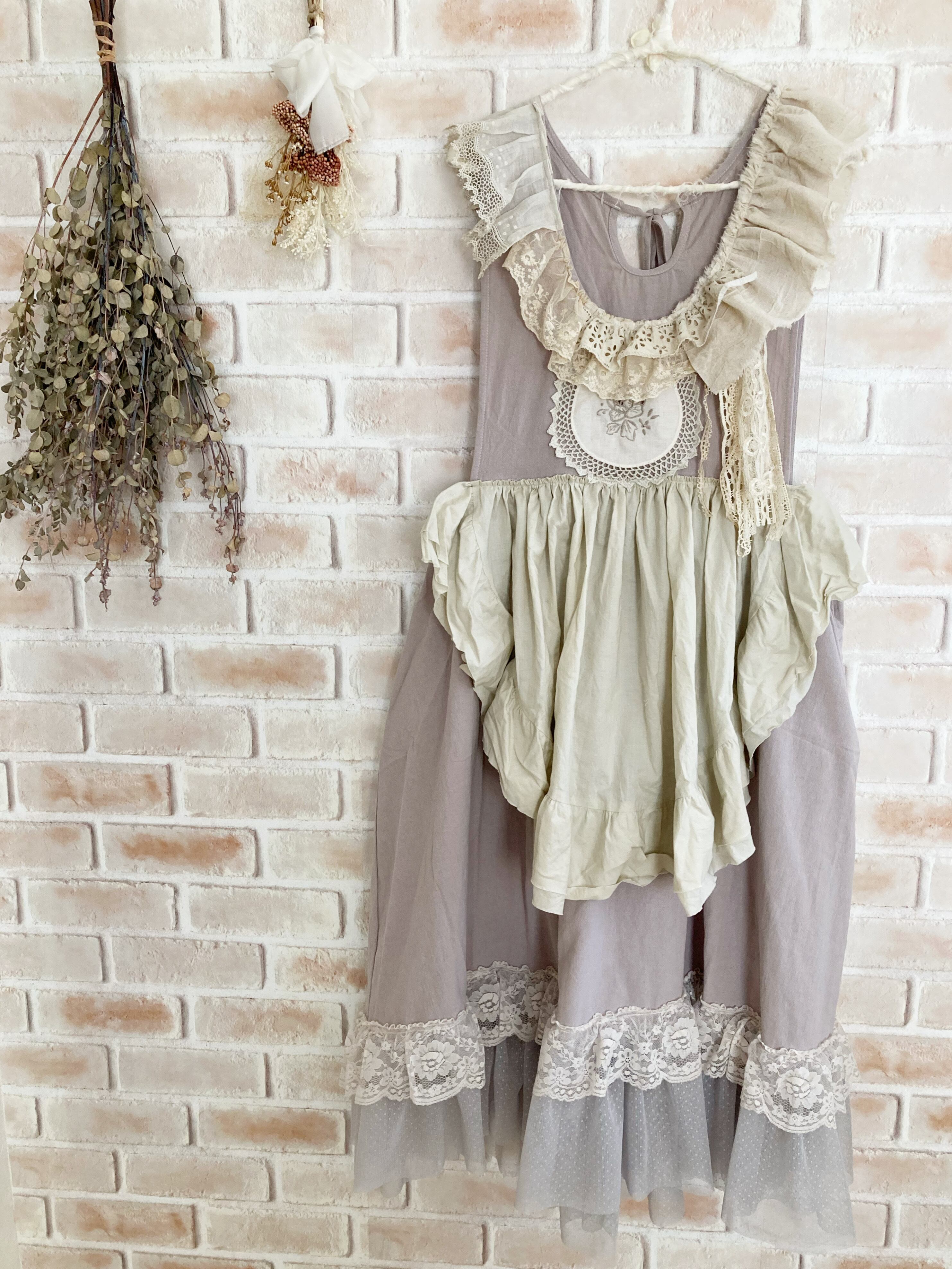 裾はグレージュのドットチュールでたっぷりのフリルを縫い付けました。