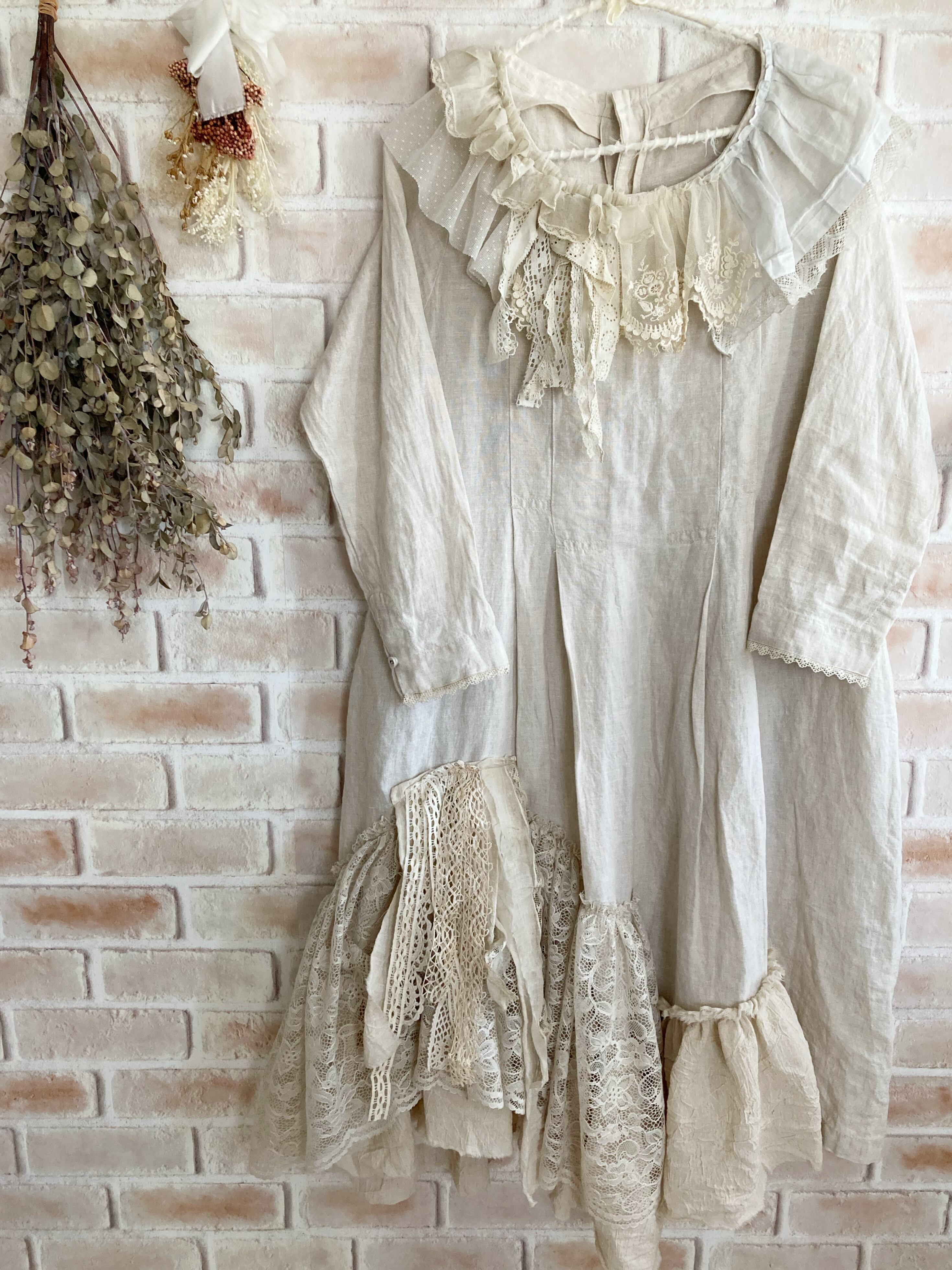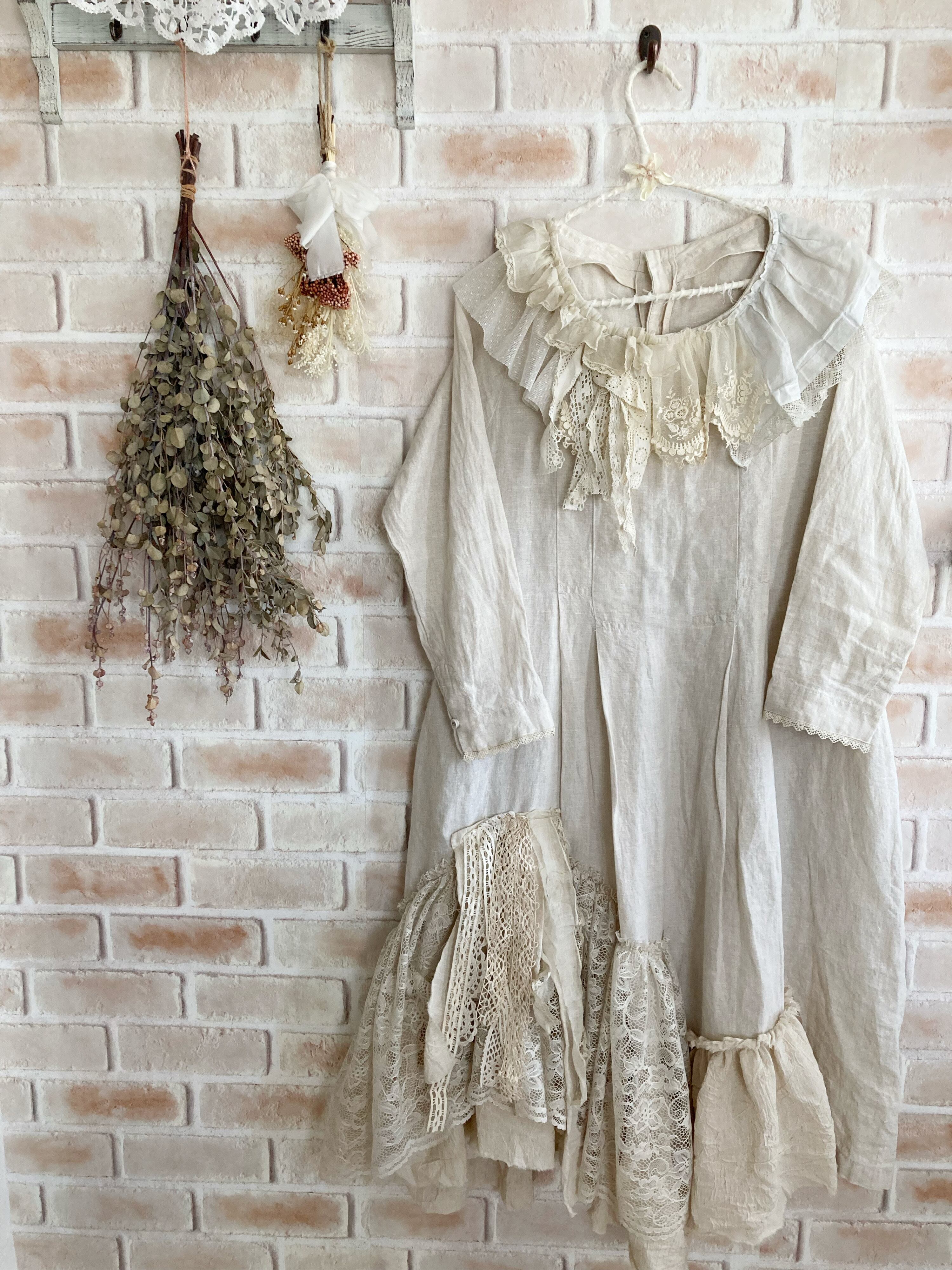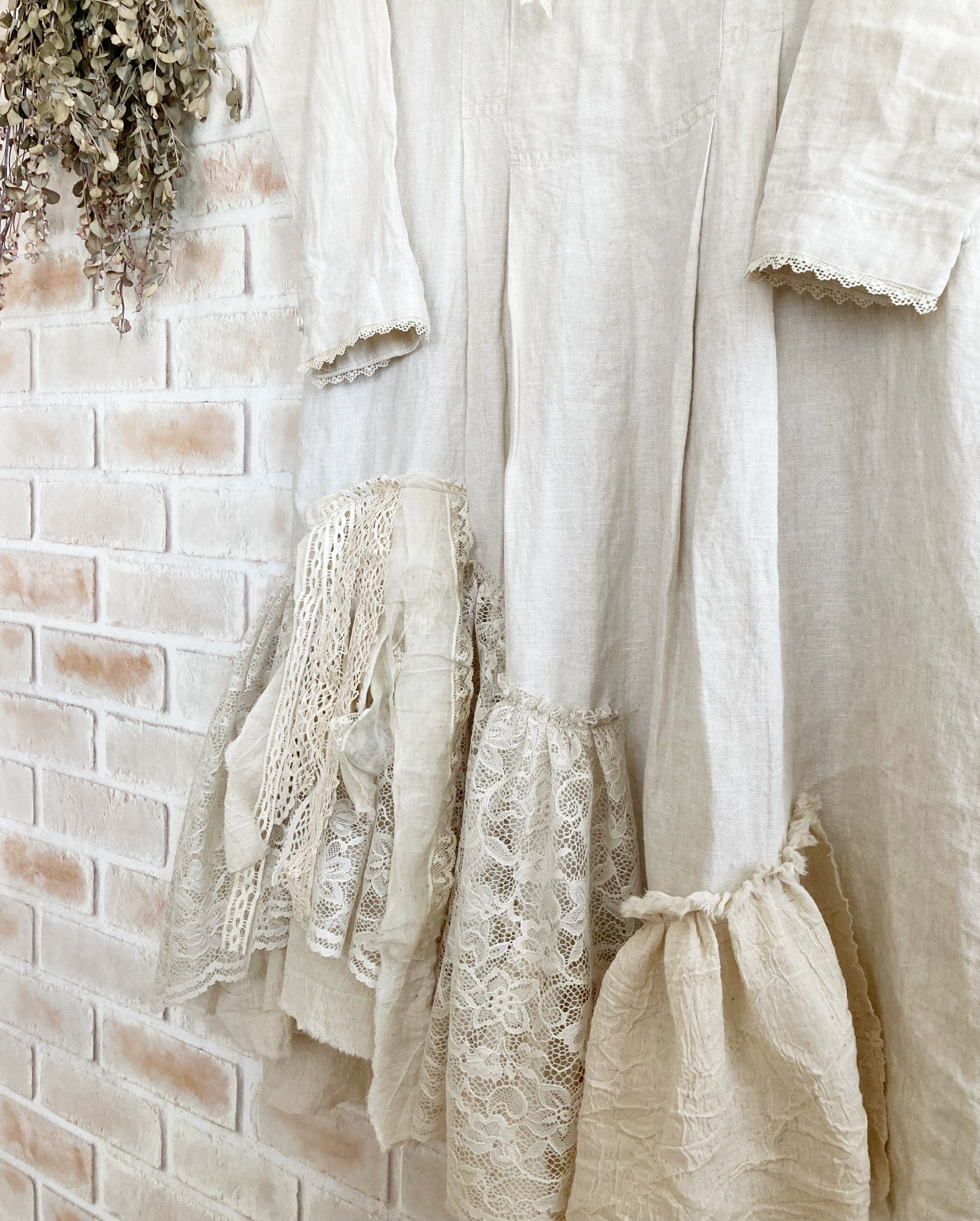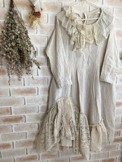 リネンワンピースに、アンティークレースをたくさん使ってでリメイクしました。