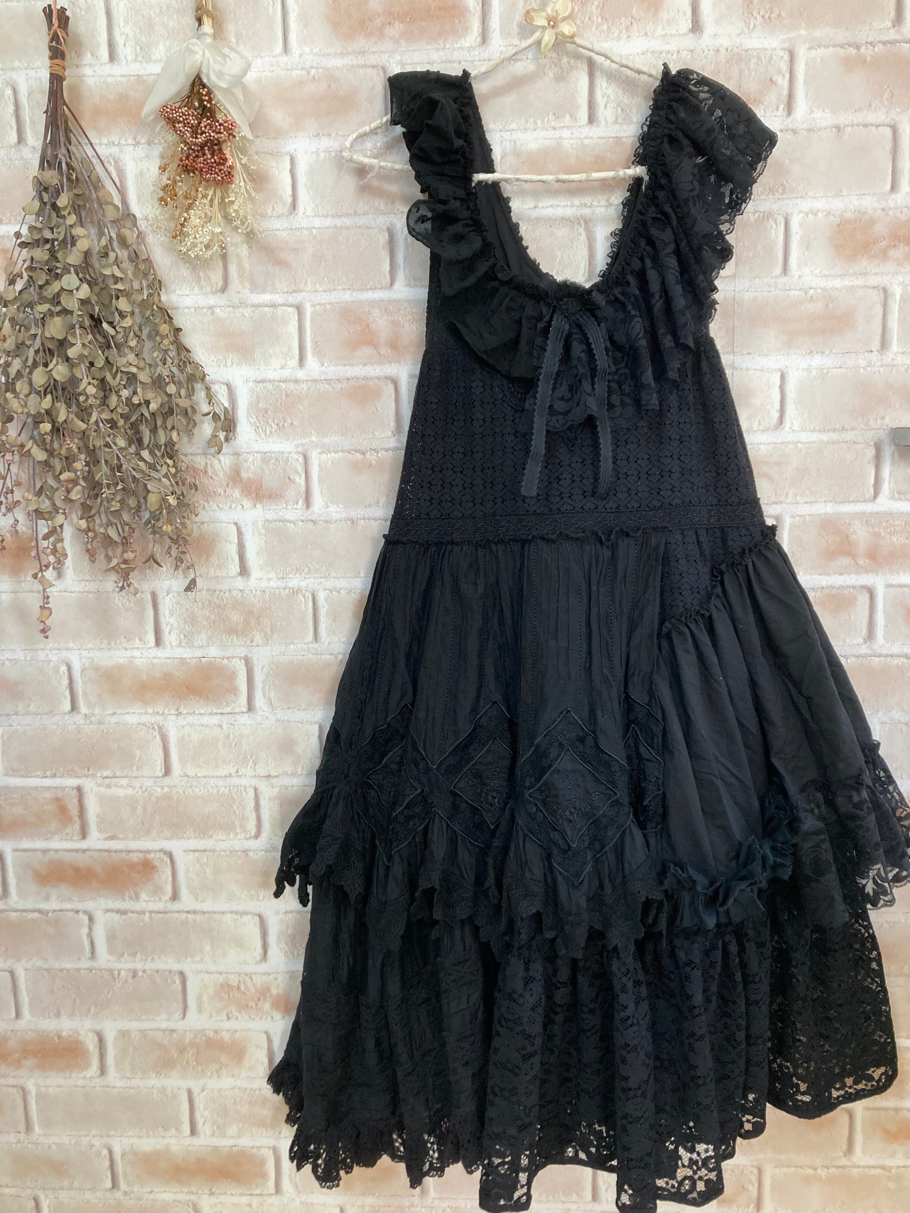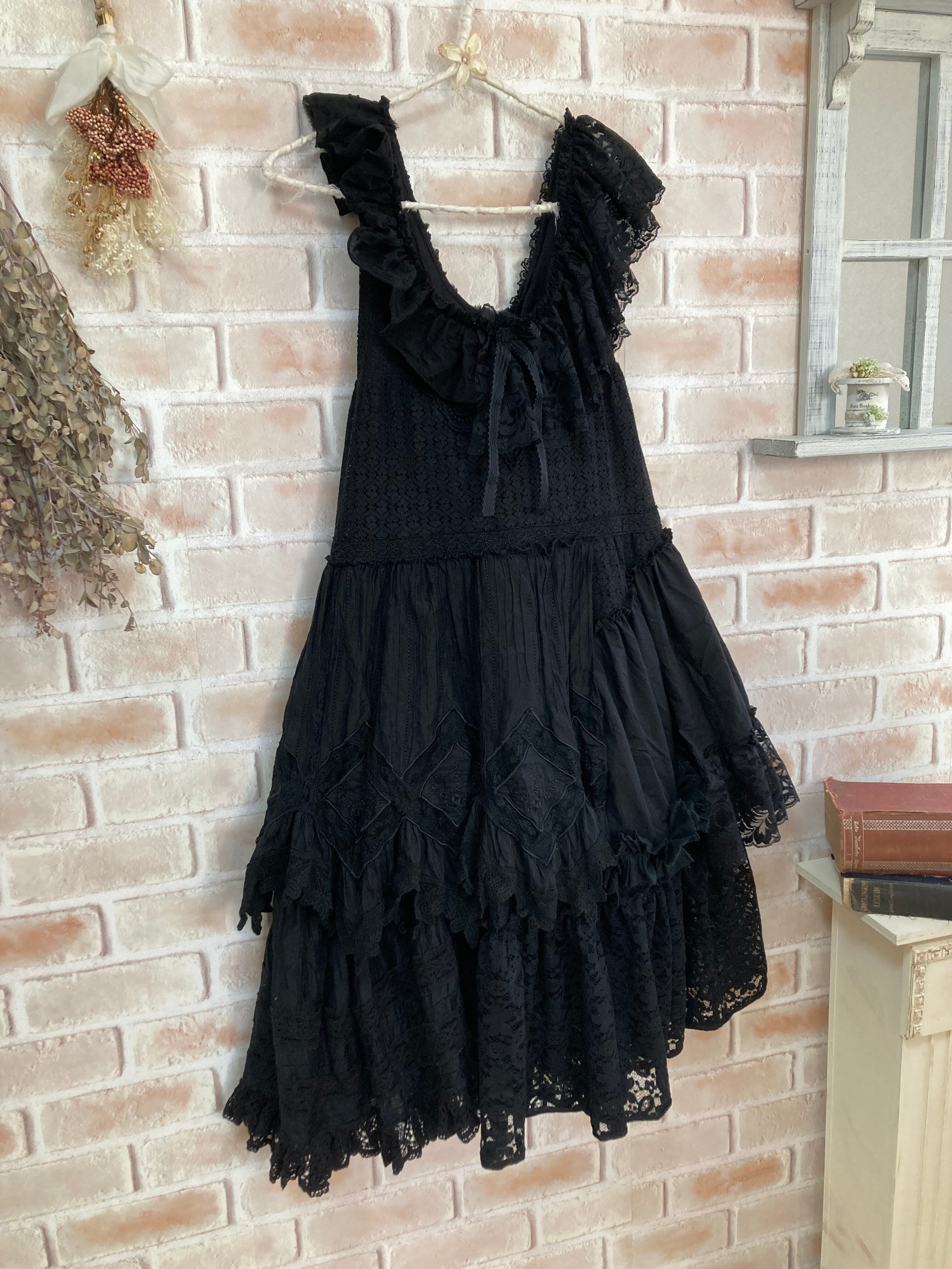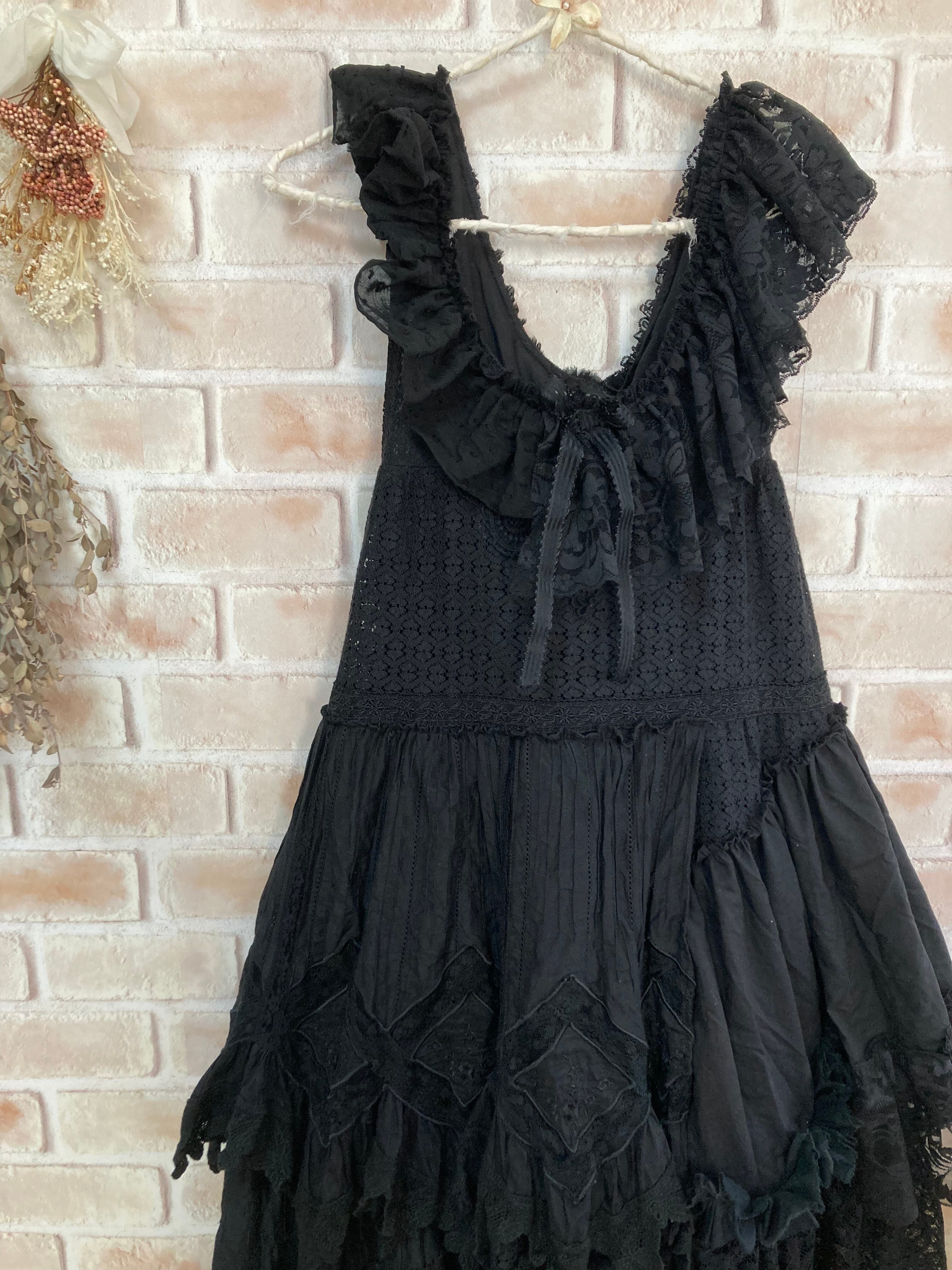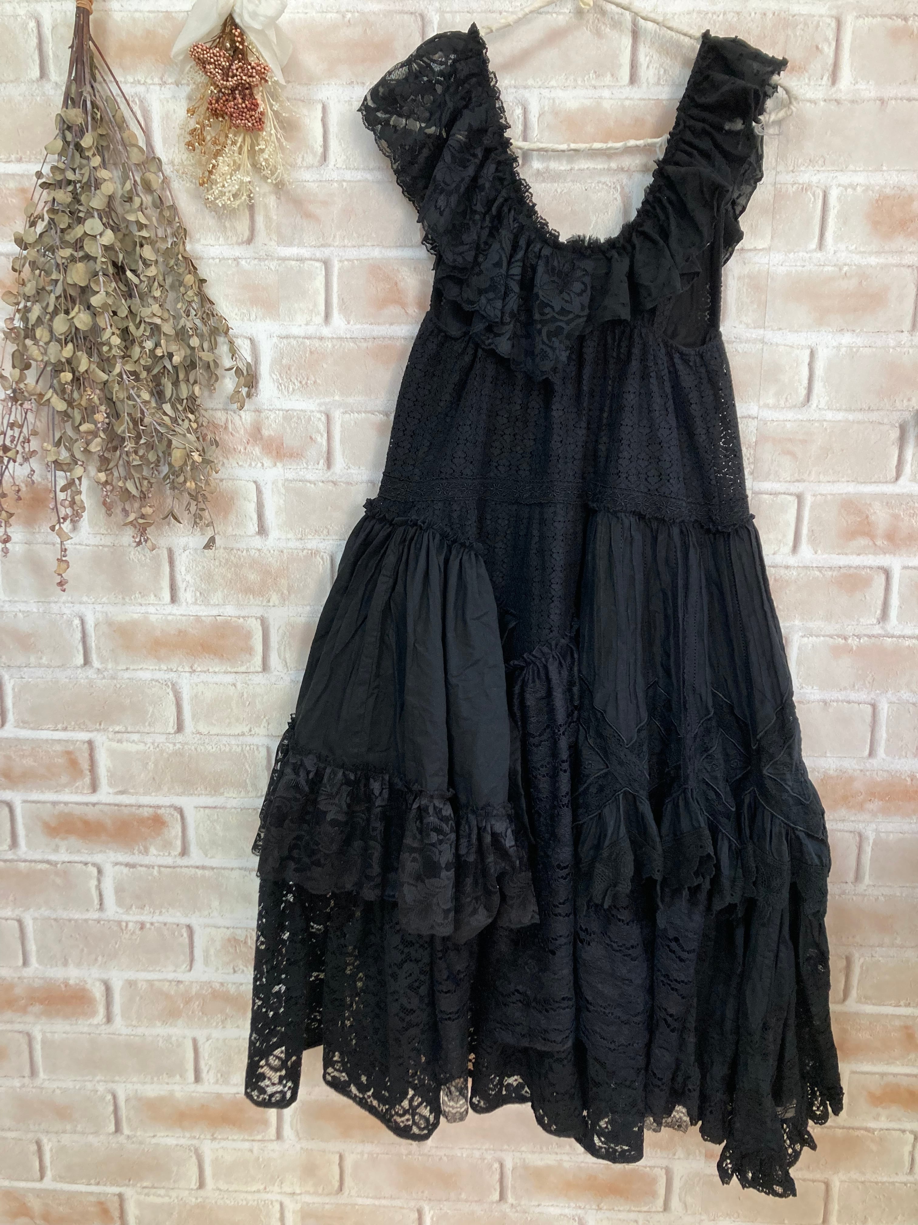 総レースのブラックワンピース に、解体した古着やレースで、リメイクしました。