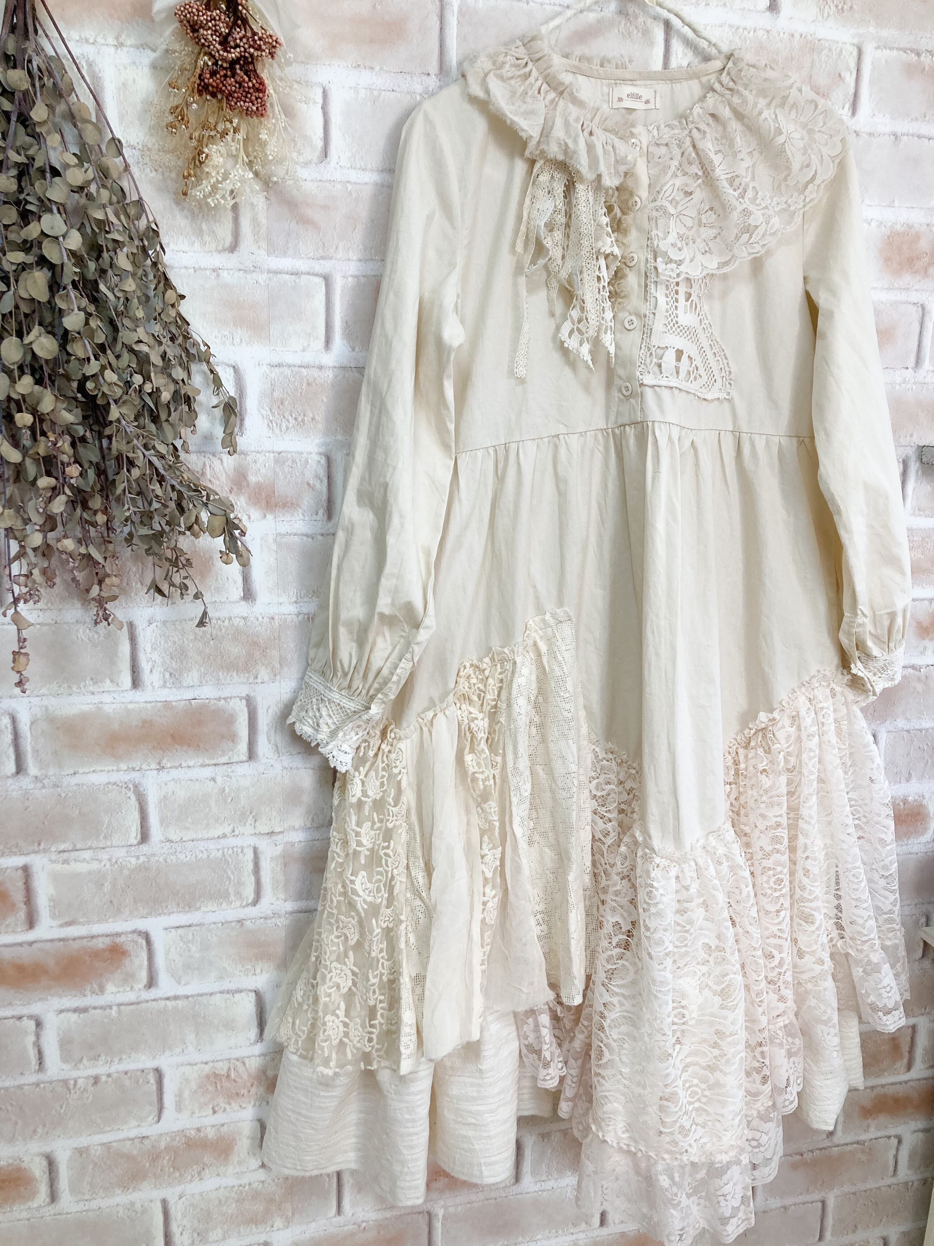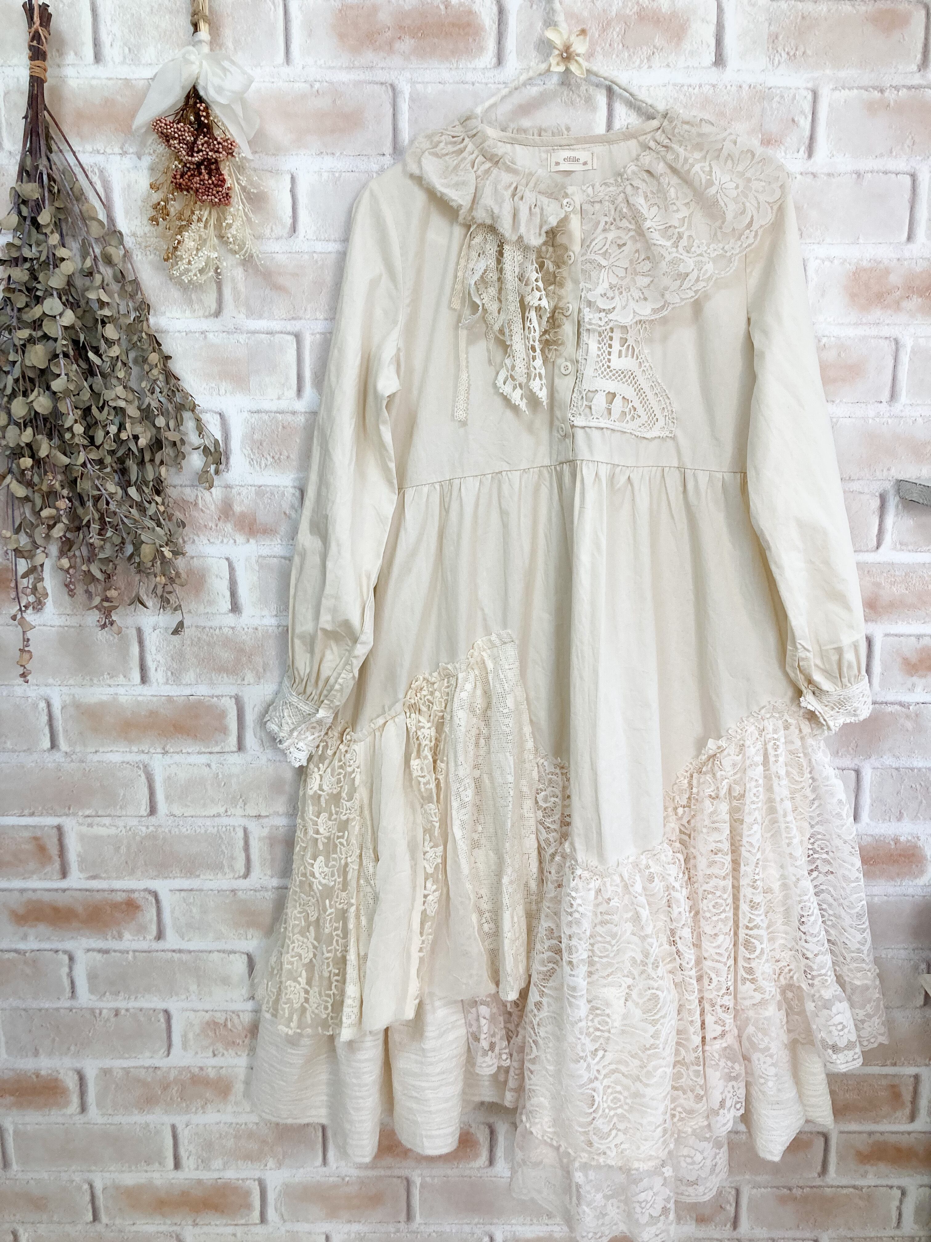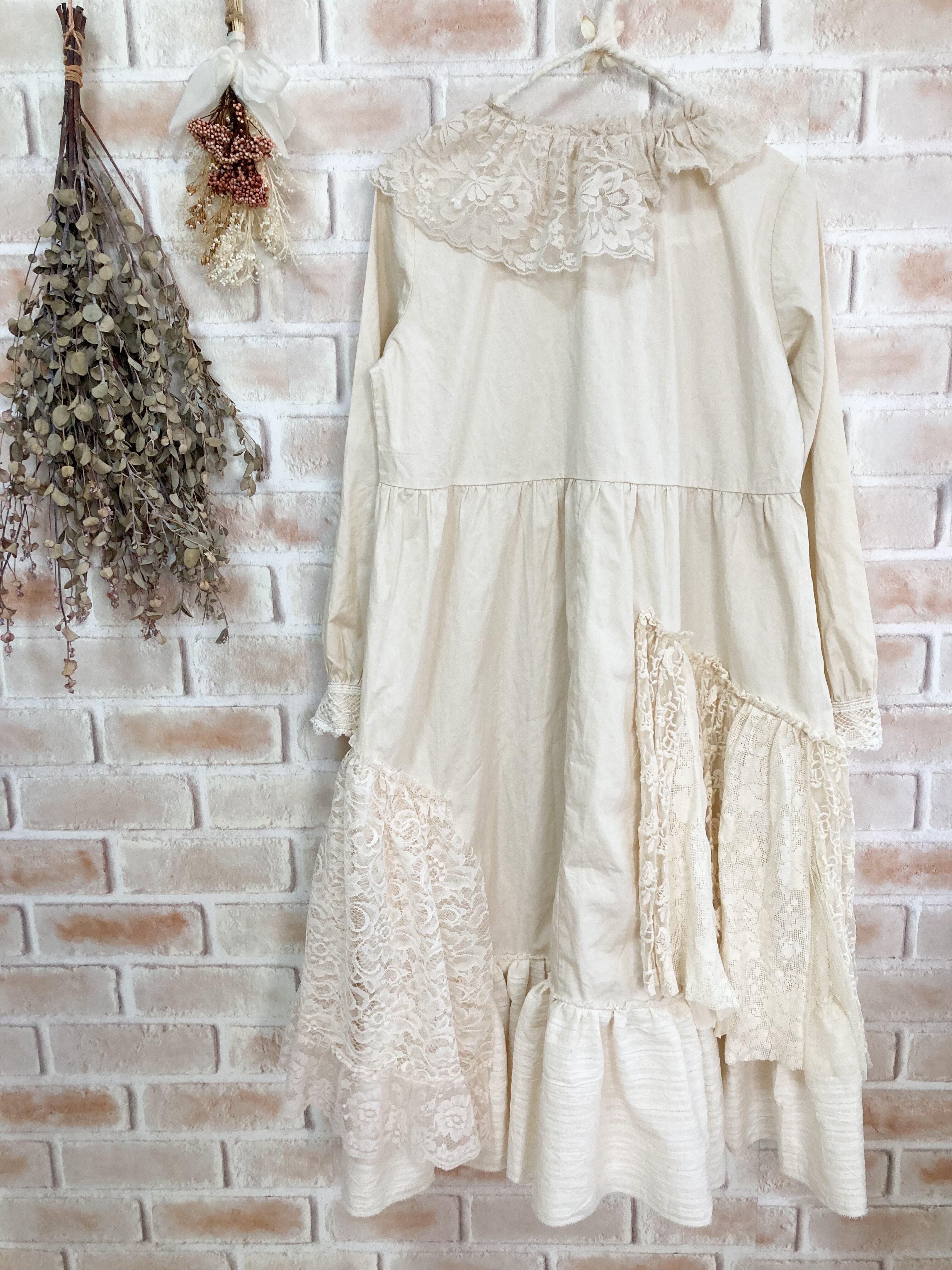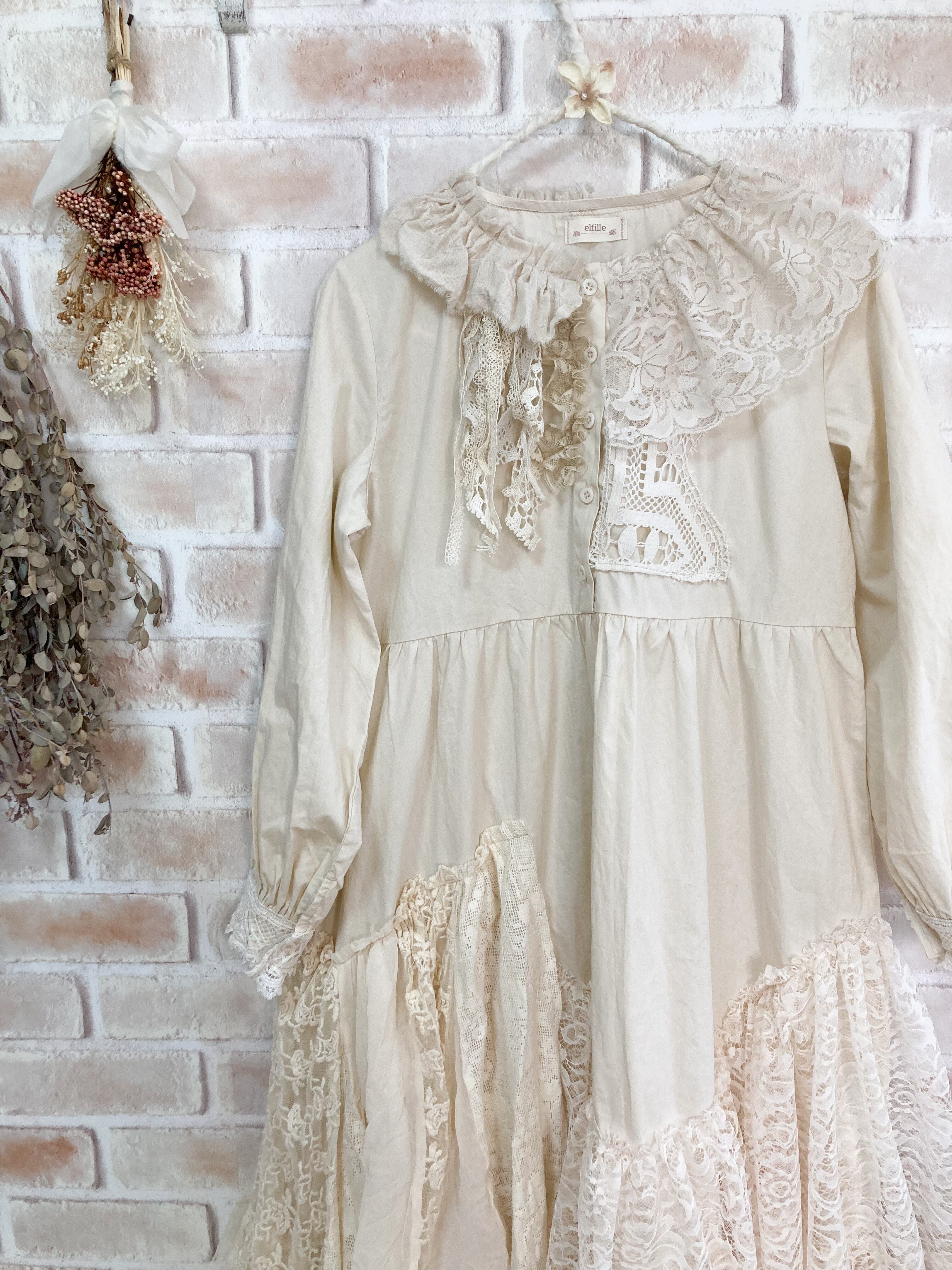 長袖の軽やかなワンピース に、アンティークレースや、解体した古着、レースなどでデザインしてリメイクしました。