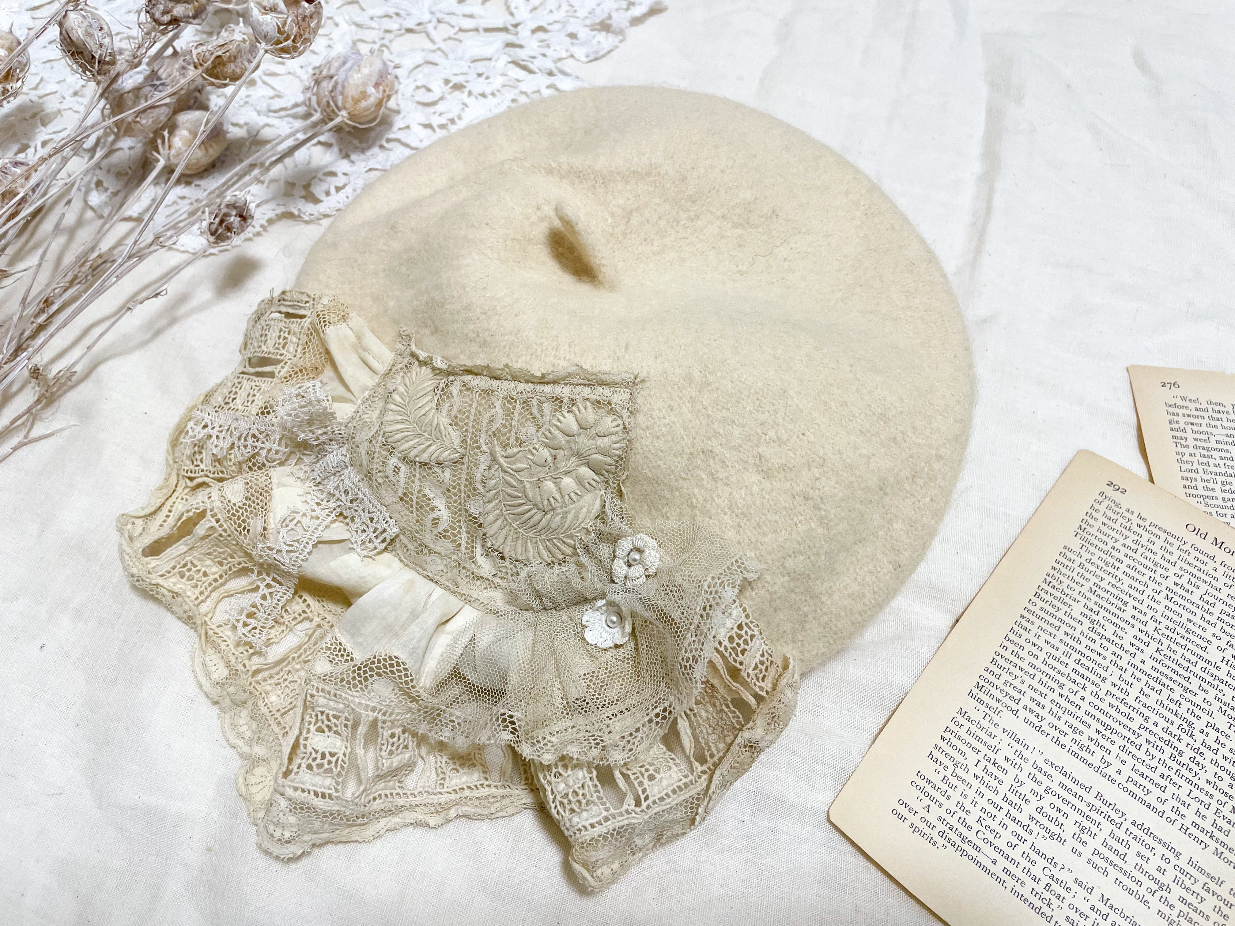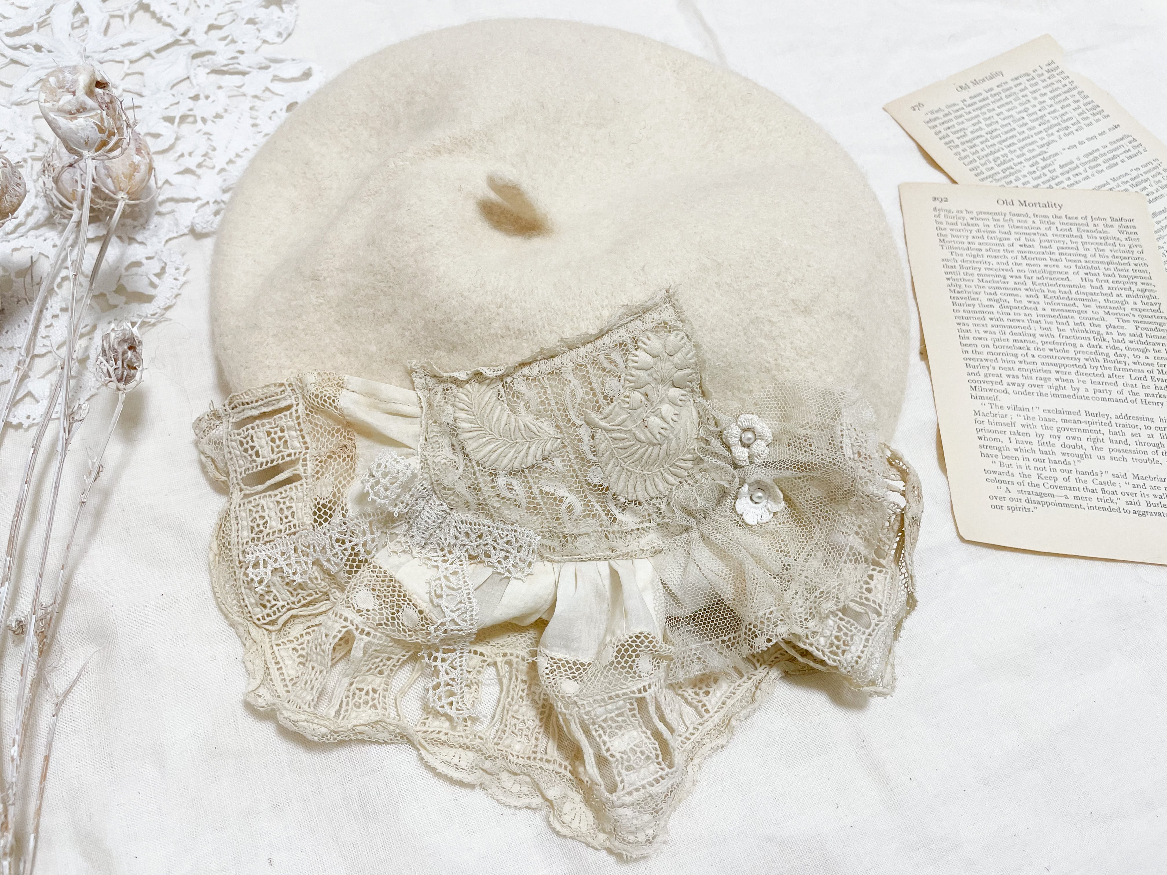 アンティークレースをコラージュしてリメイクしたベレー帽です。