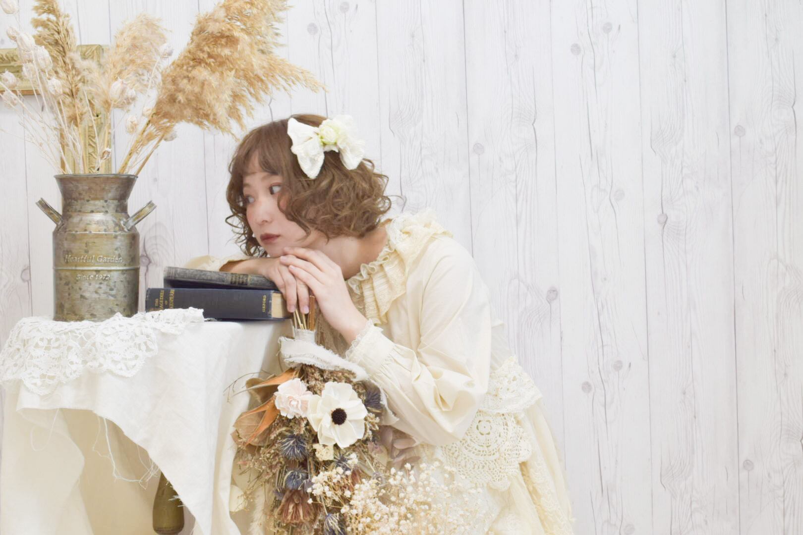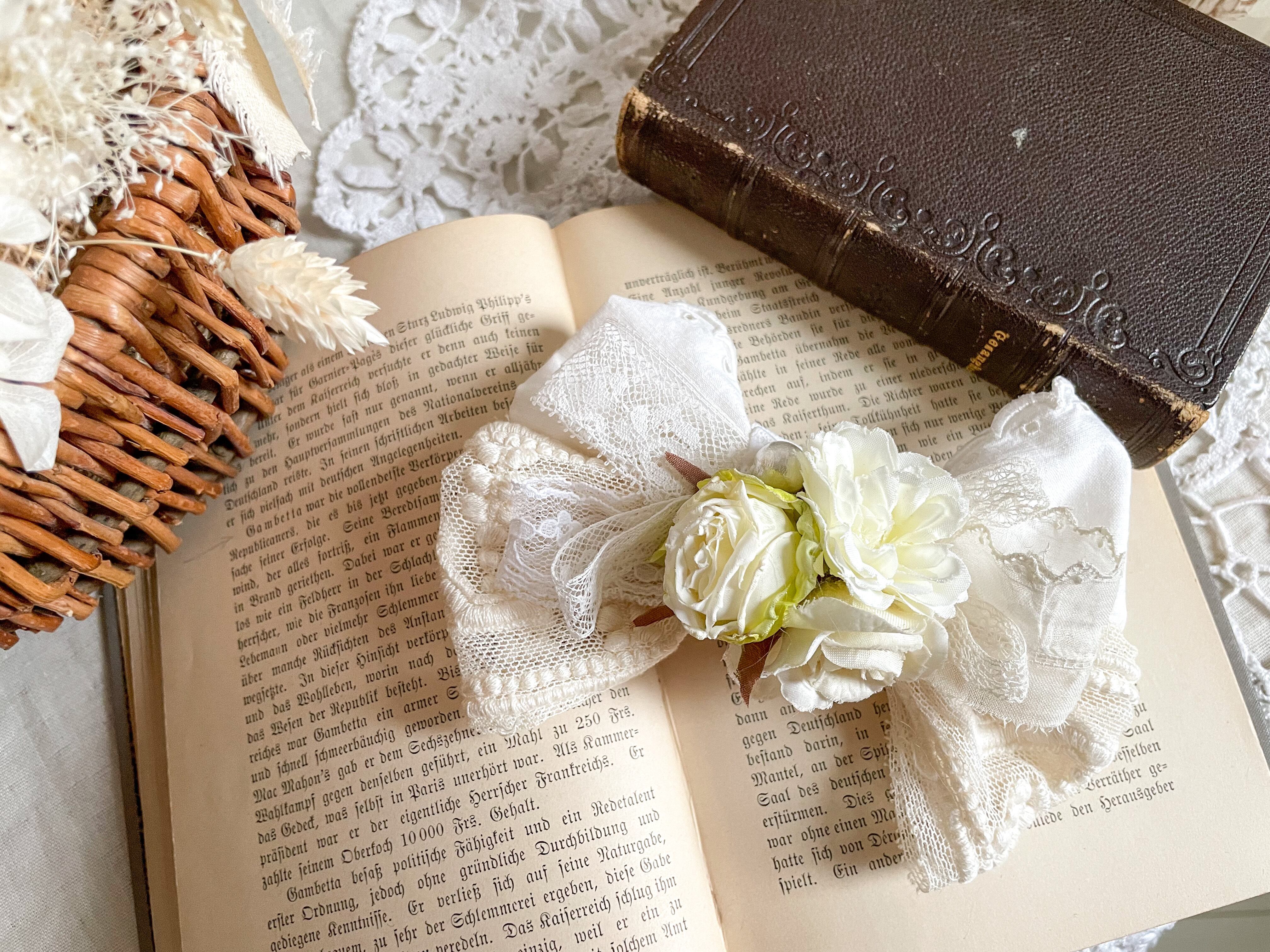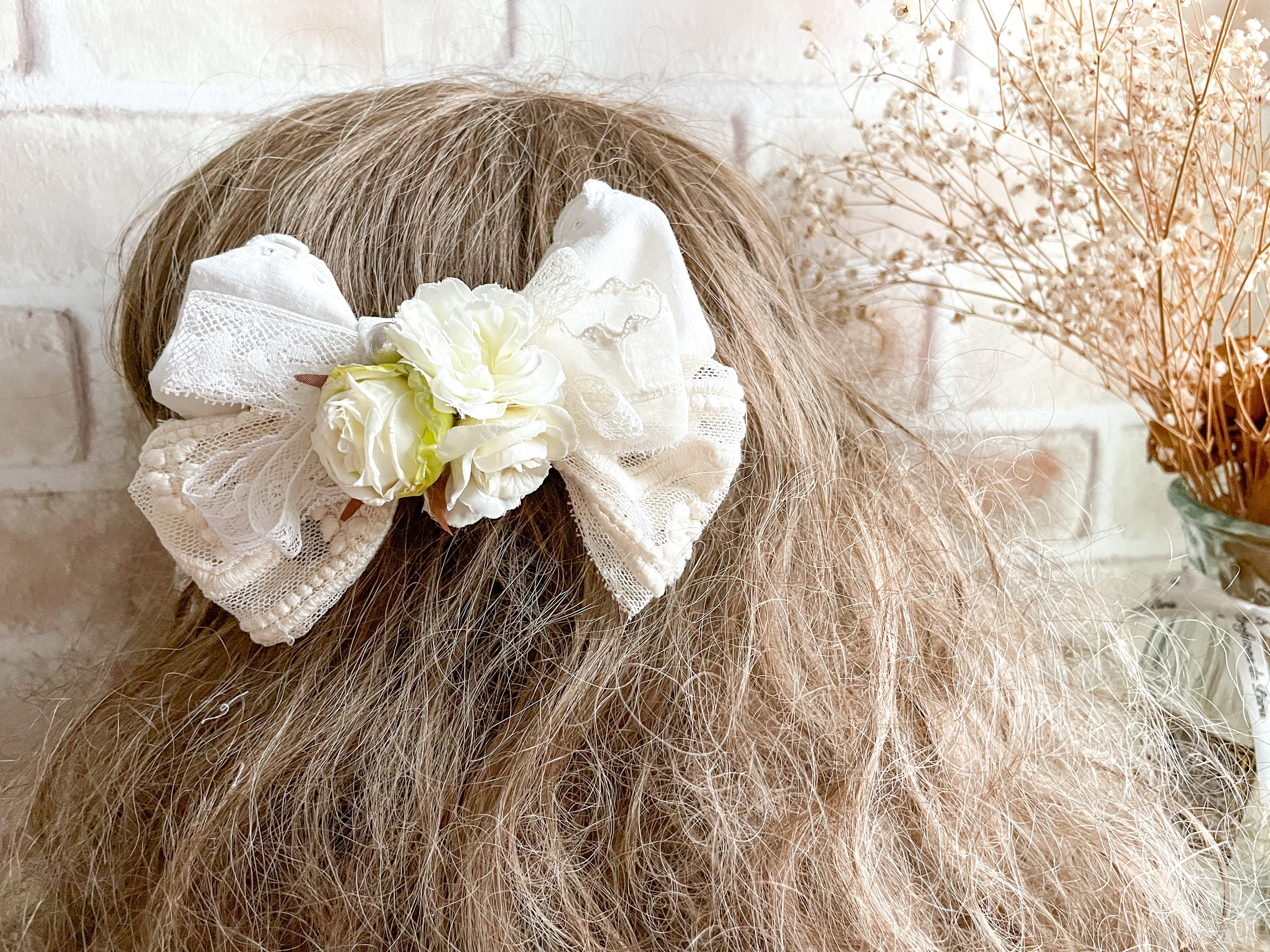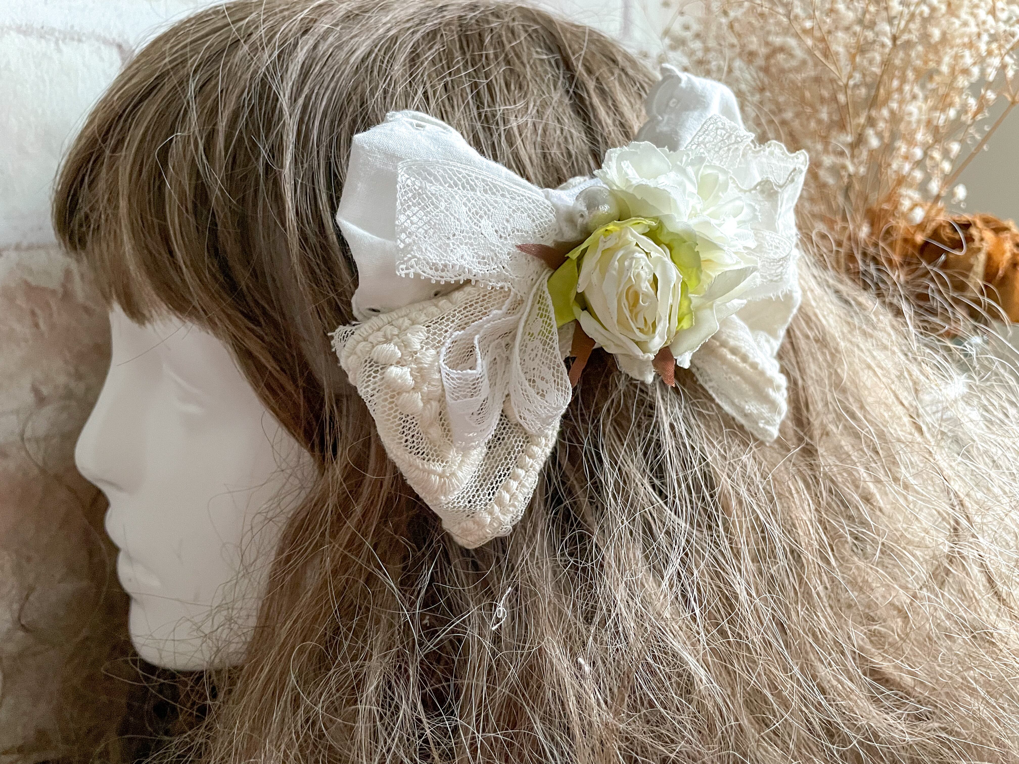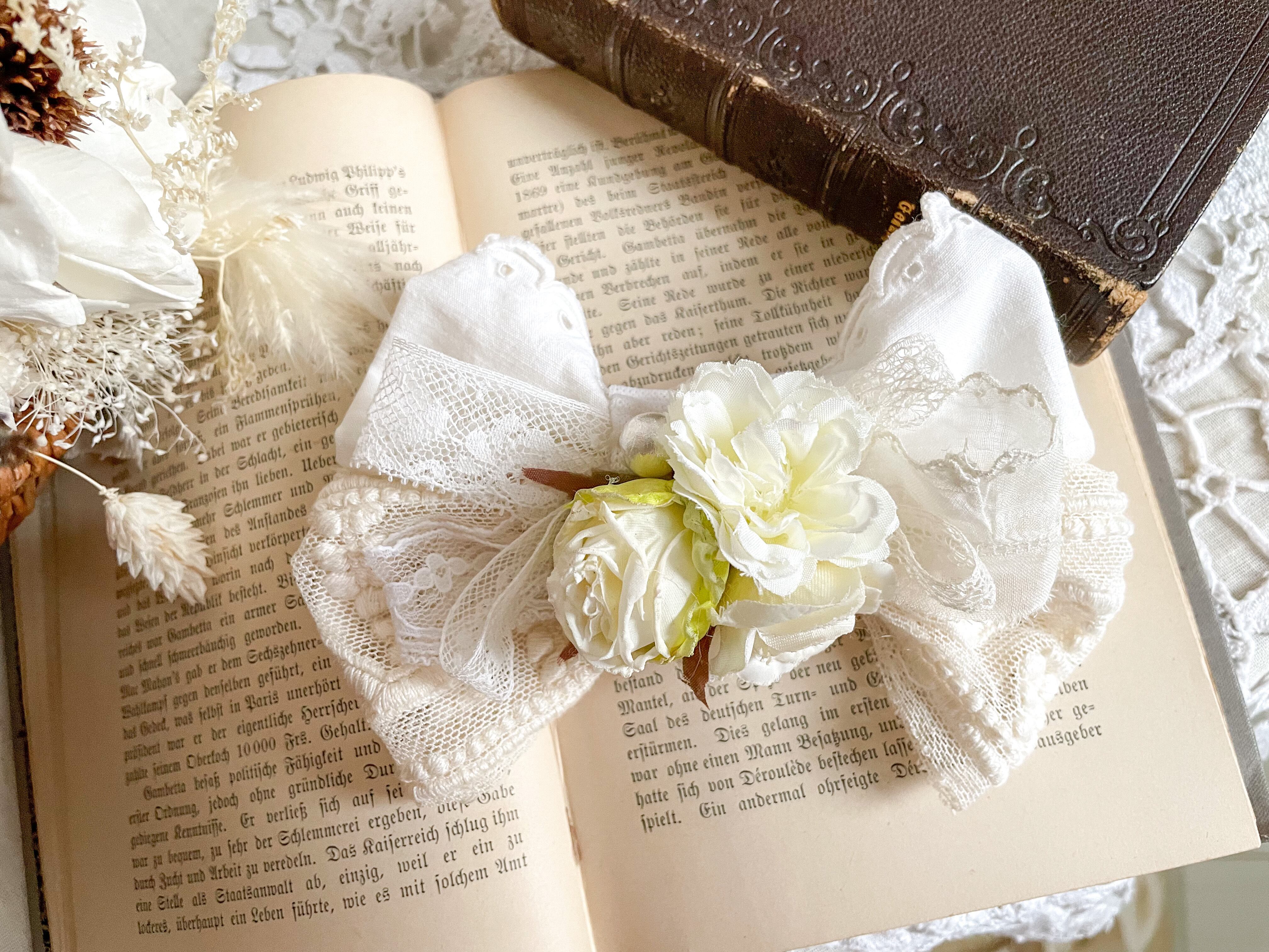 アンティークレースとアーティシャルフラワーを使ったリボンヘアクリップ♪