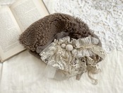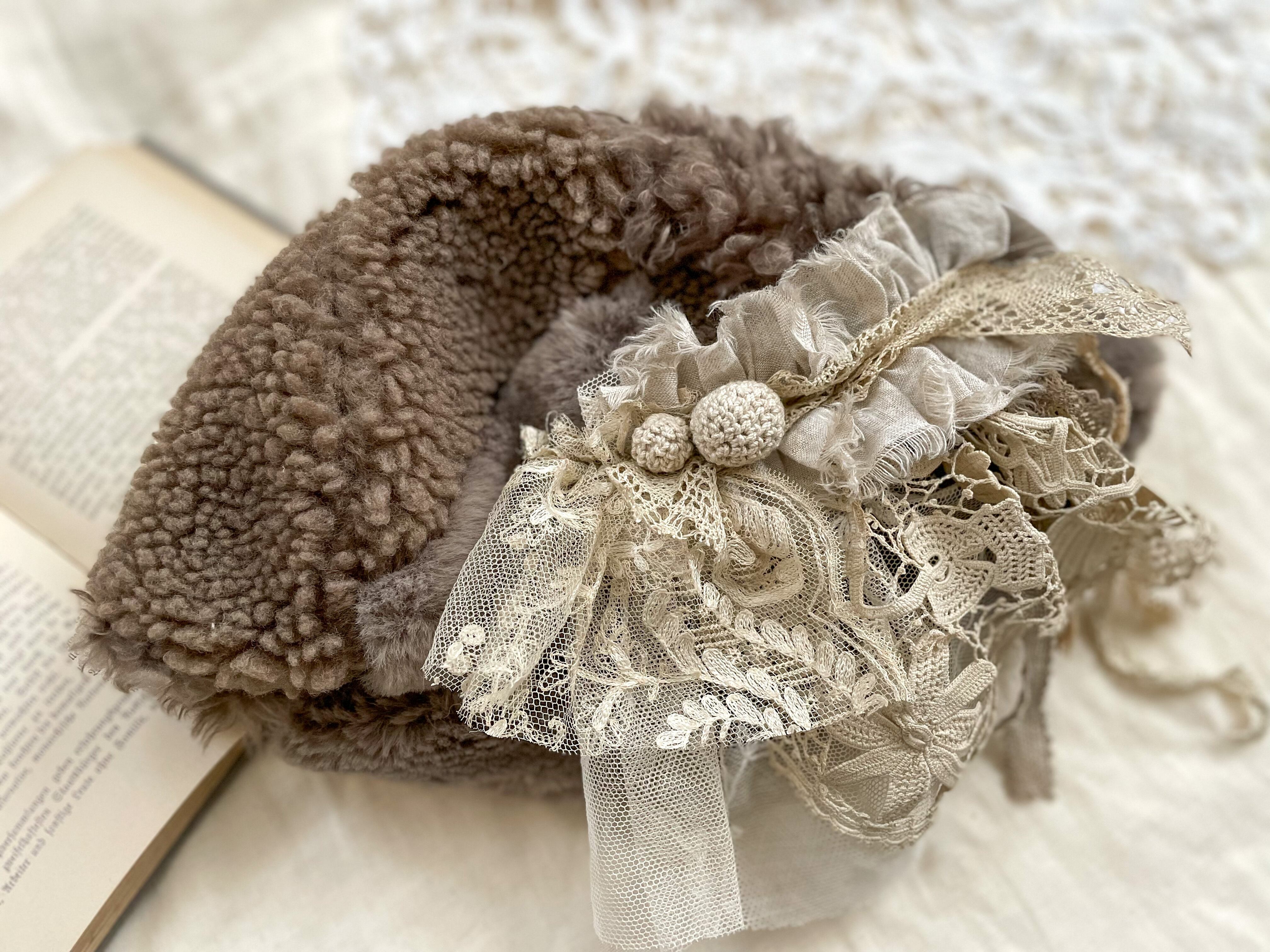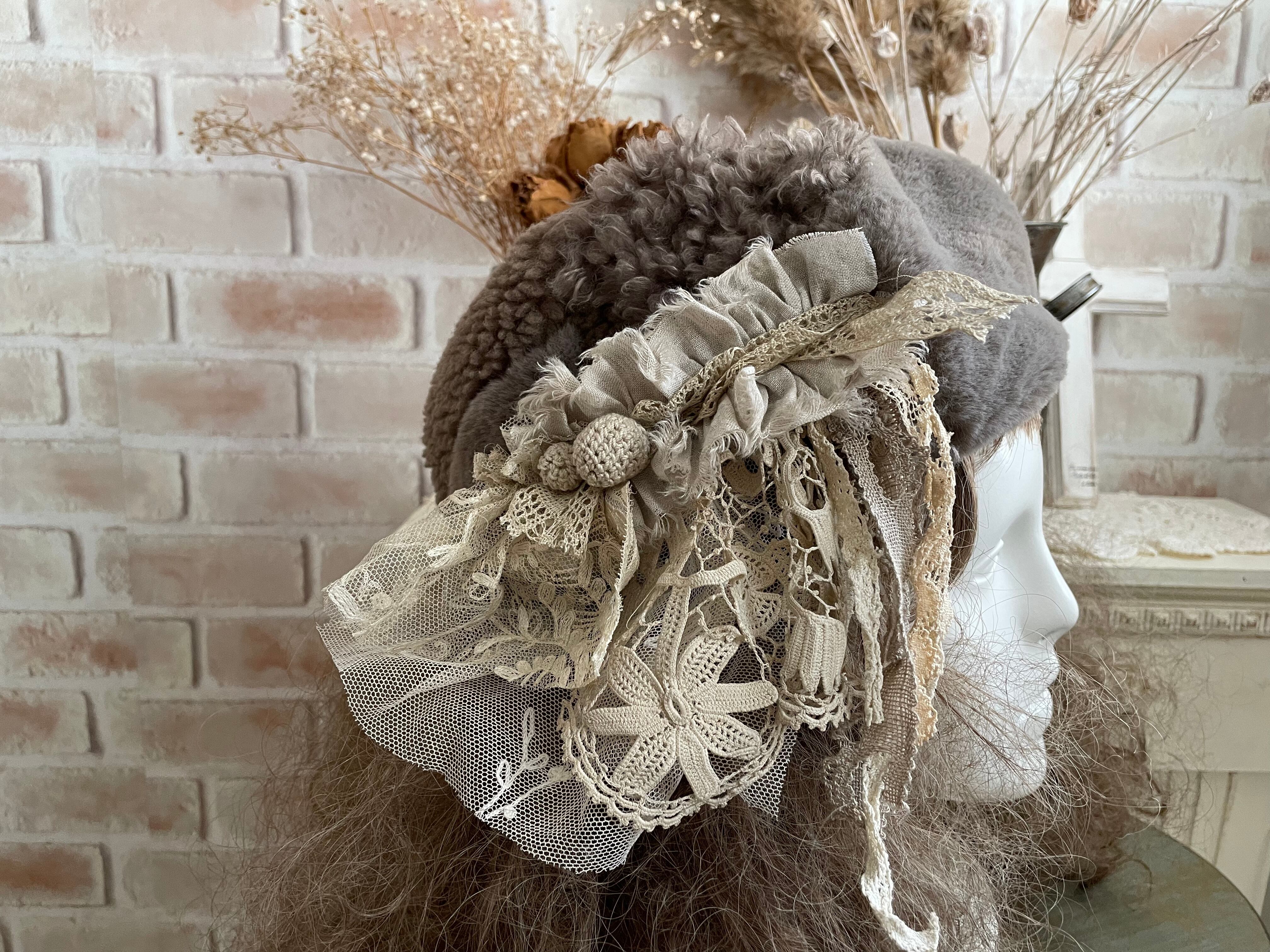 ブラウンカラーのパッチワークファーベレー帽に、アンティークレースをコラージュしました。