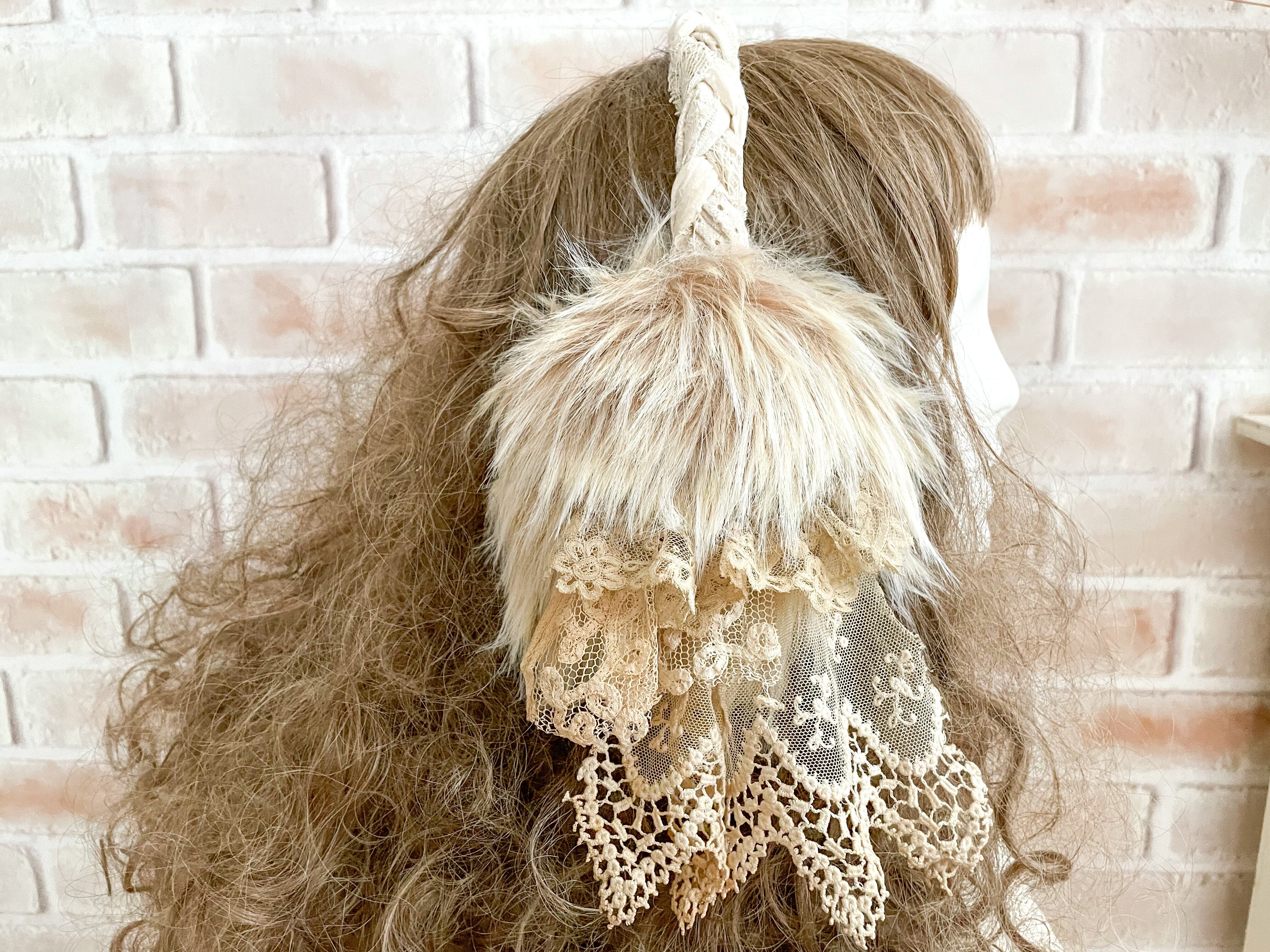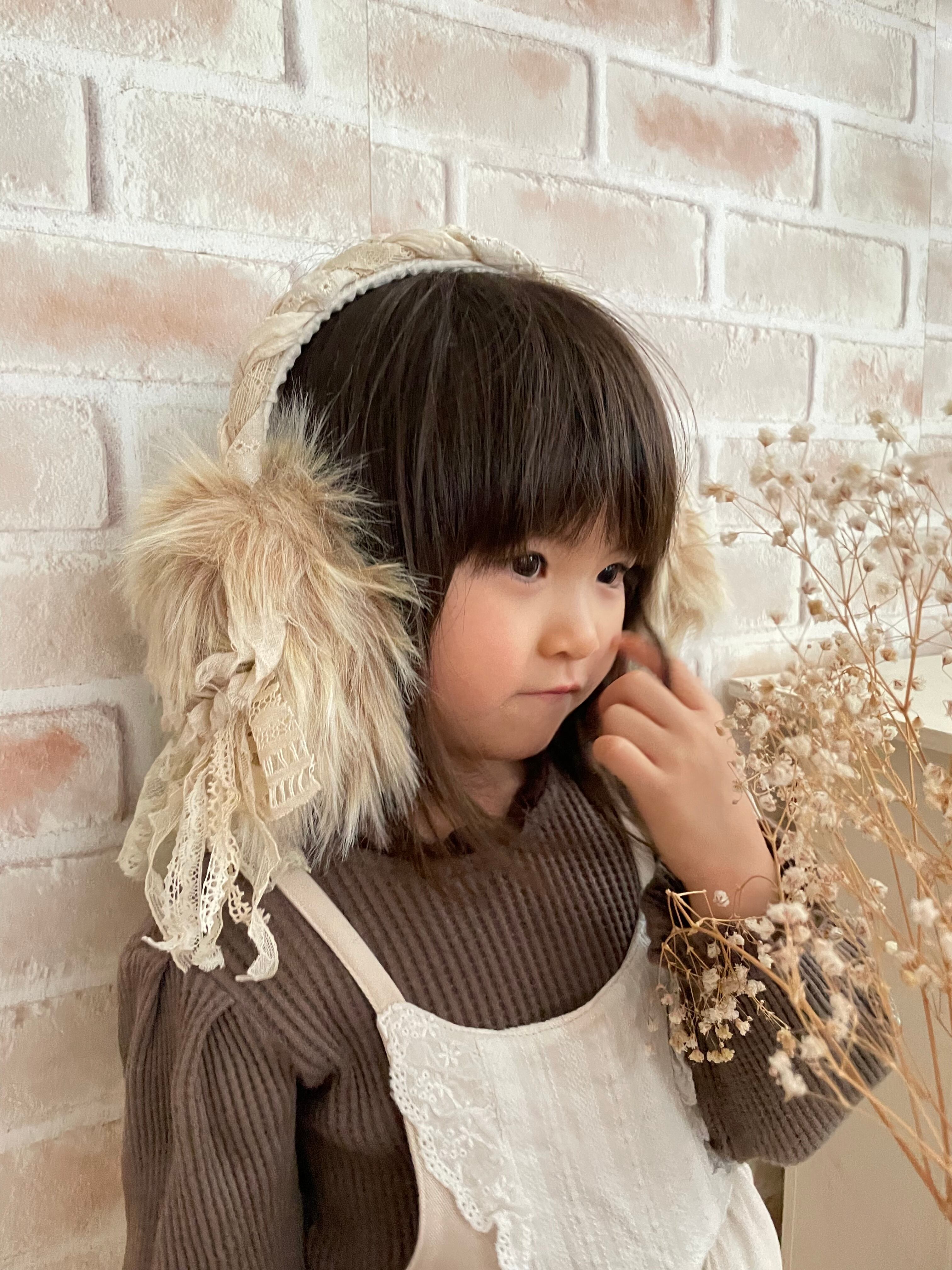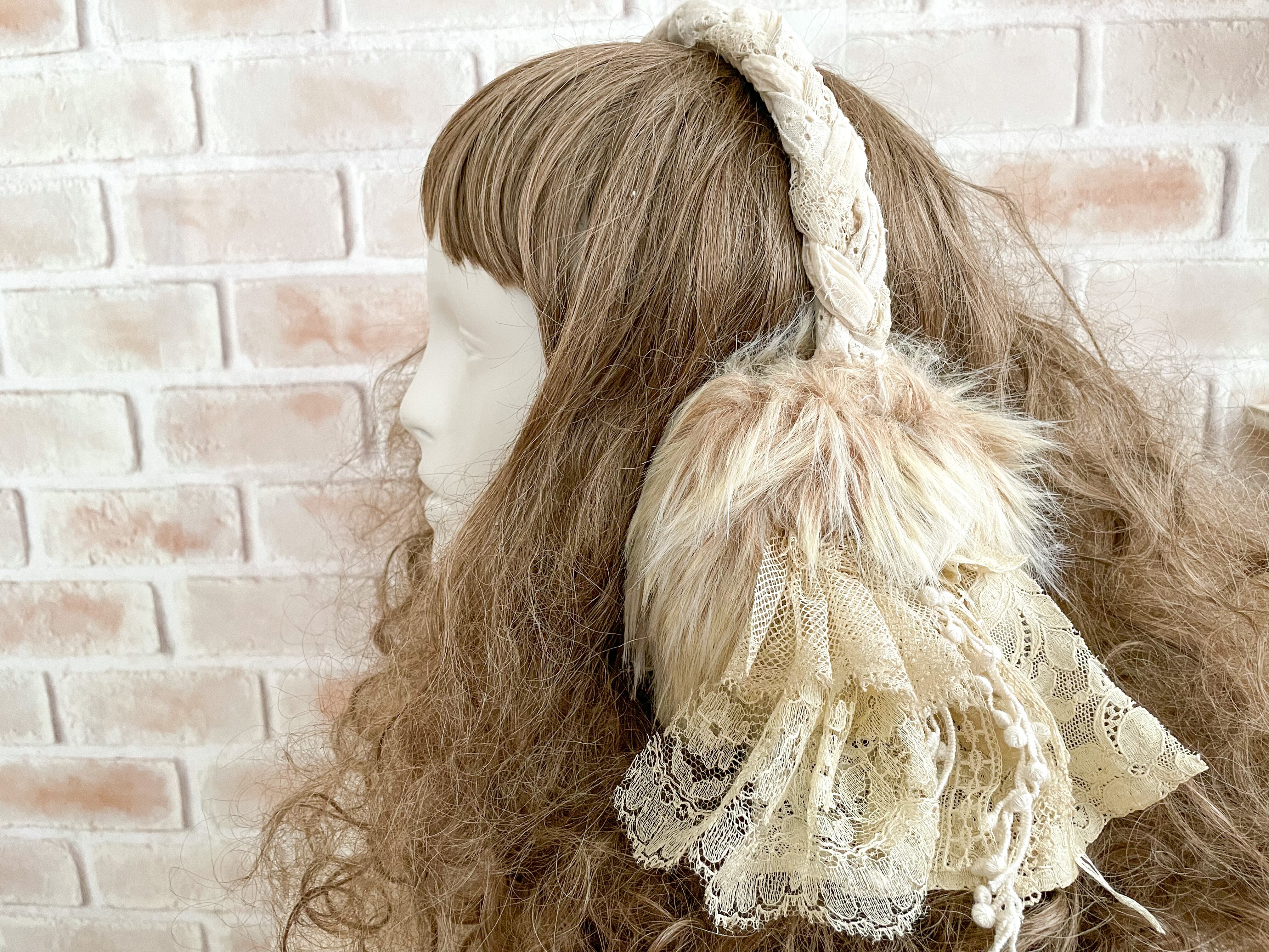 アンティークレースでコラージュした、ふわふわのフェイクファーカチューシャです。部分は裂き布の三つ編みになってます。