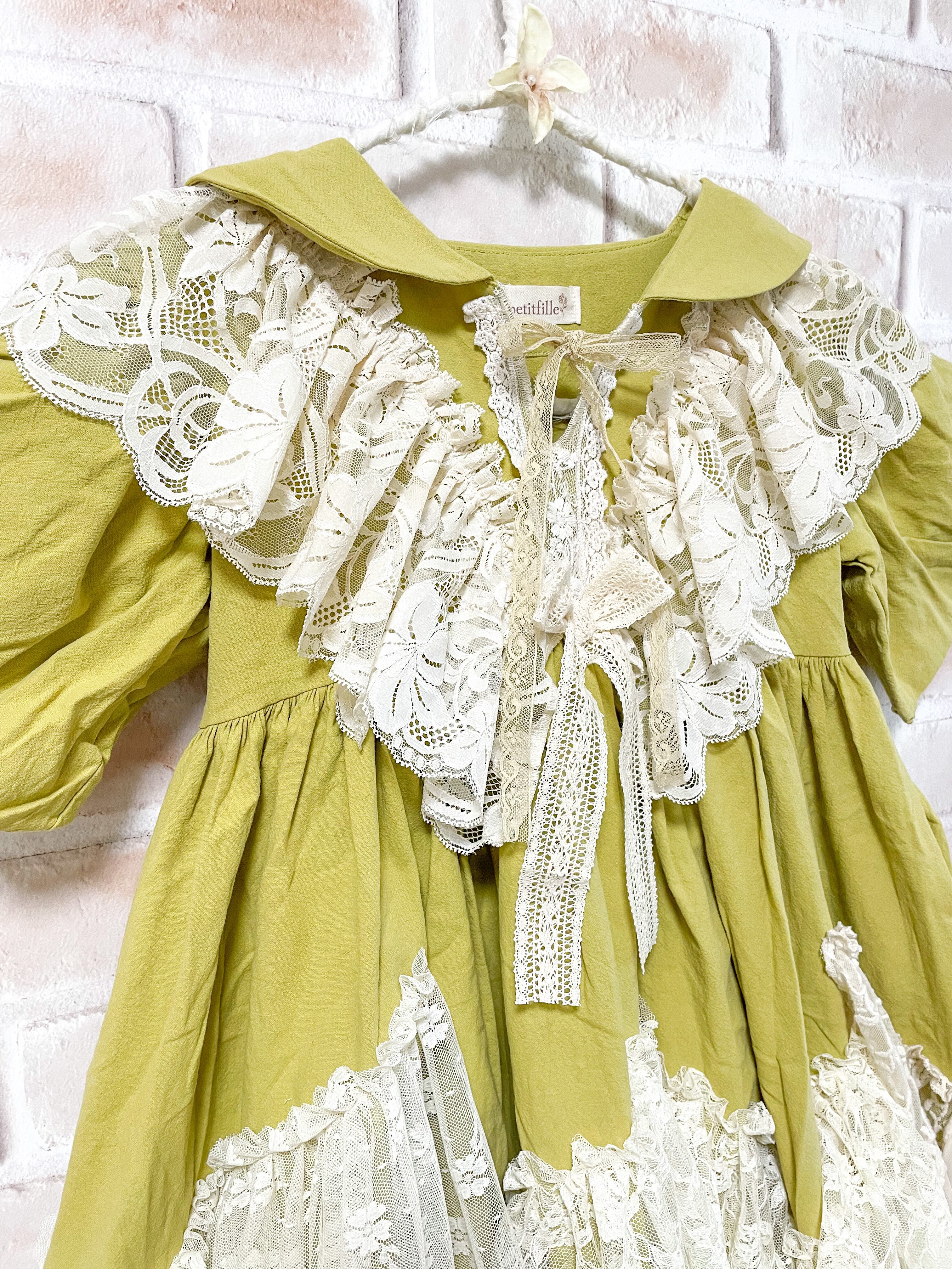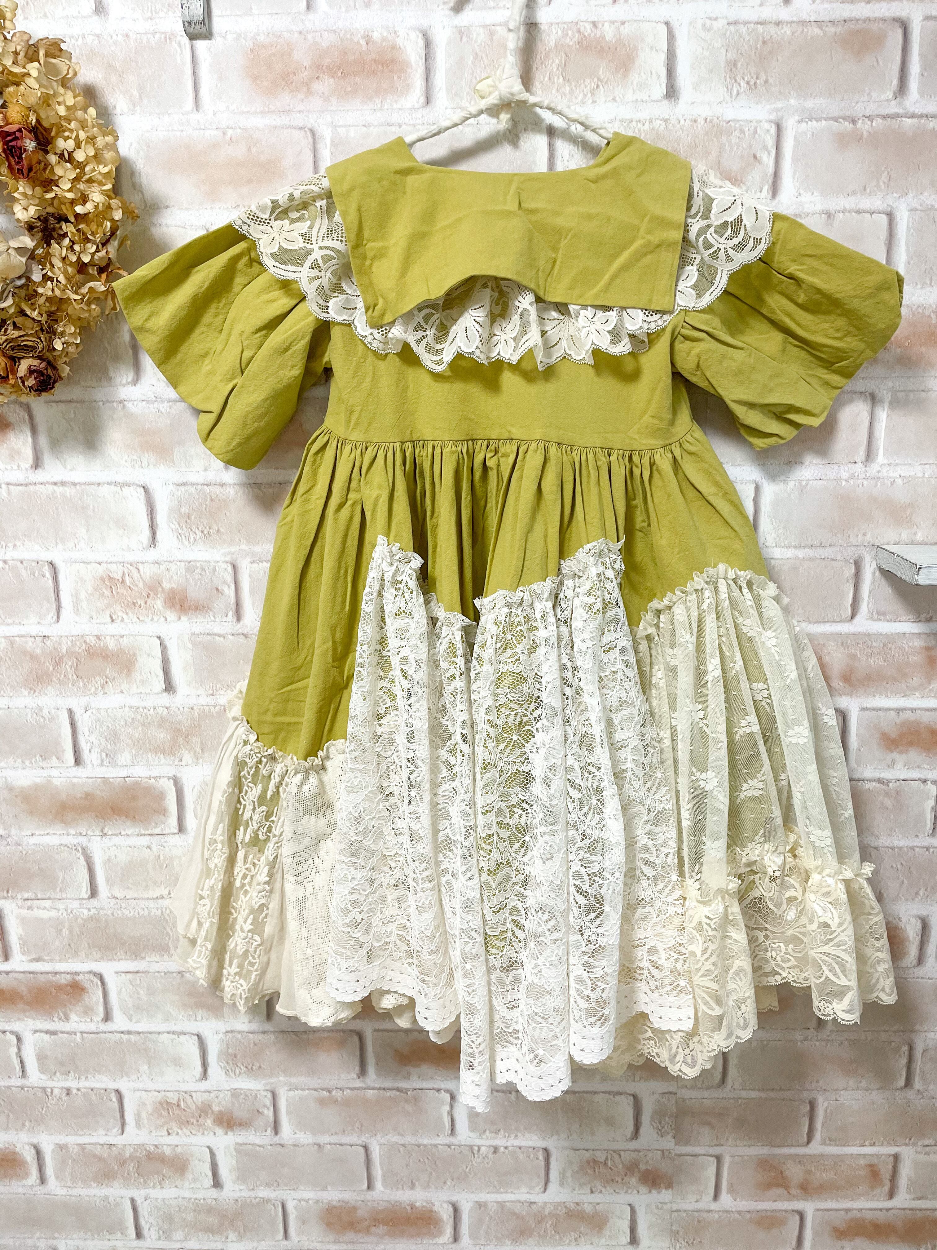 春に、ぴったりのくすみイエローカラーの、ぽわん袖ワンピース♡レースの裾がひらりと可愛いデザインです♪