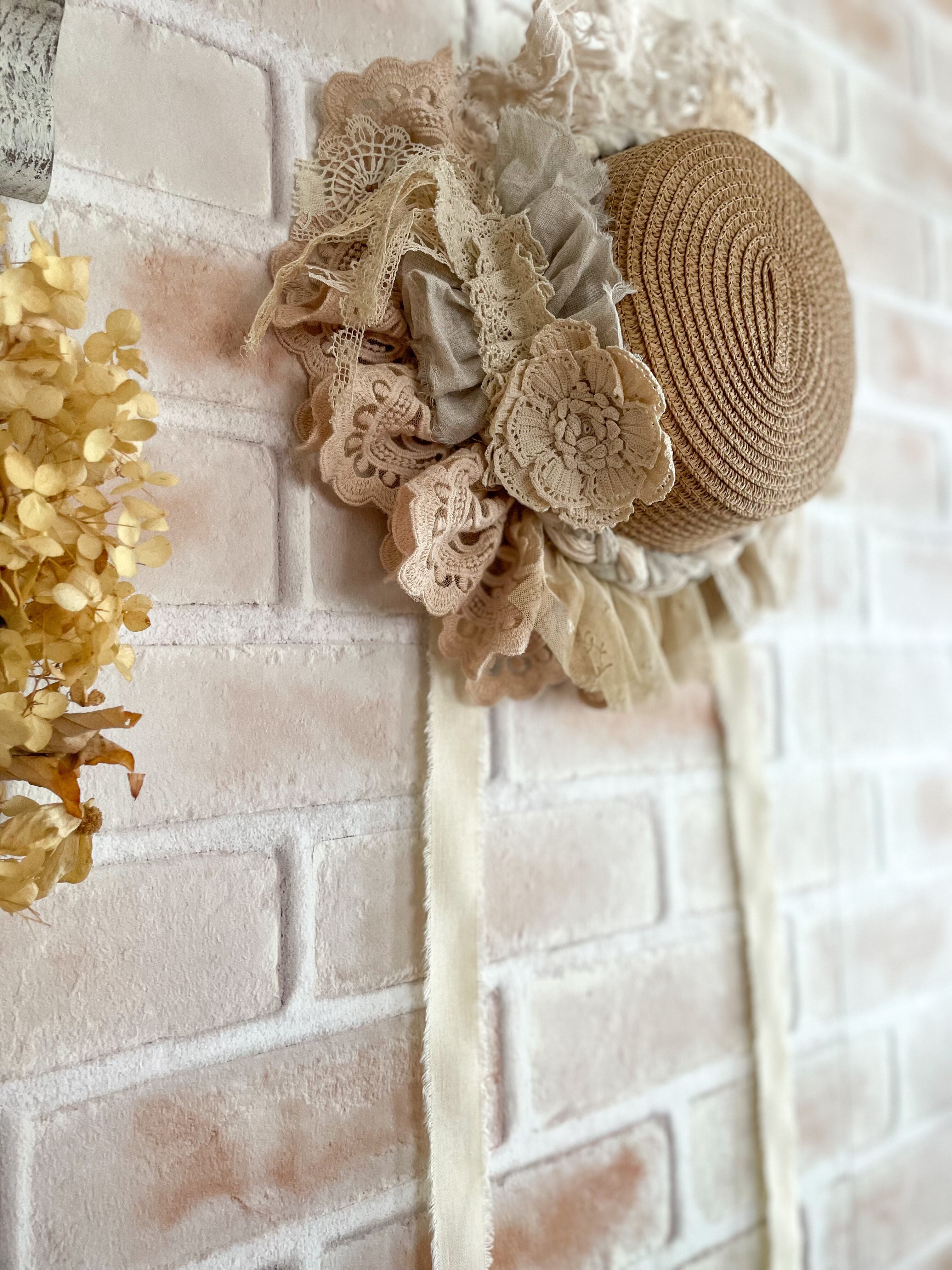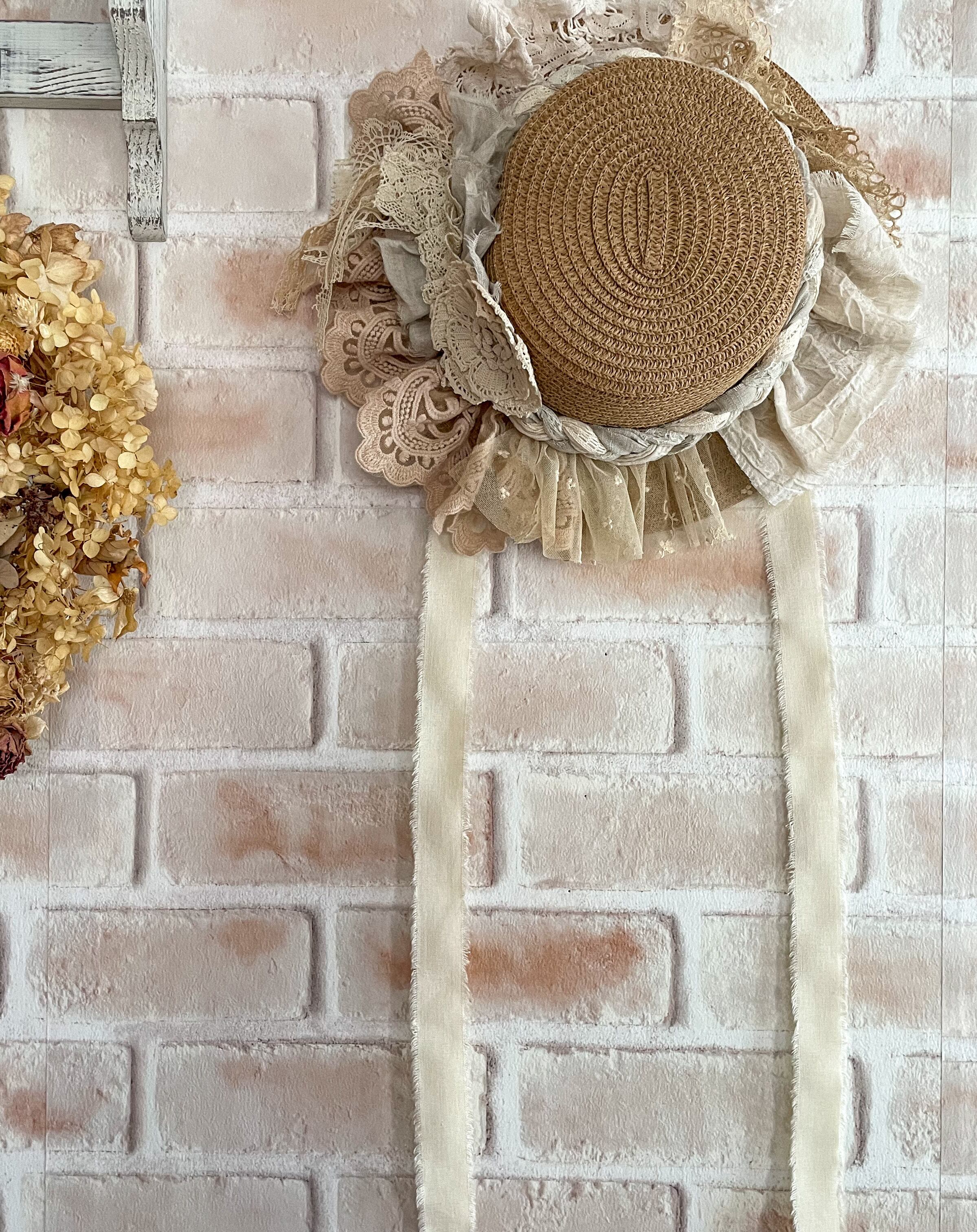 裂布の三つ編みや、アンティークレース、現行レースでデザインした、一点もののオリジナルカンカン帽です。
