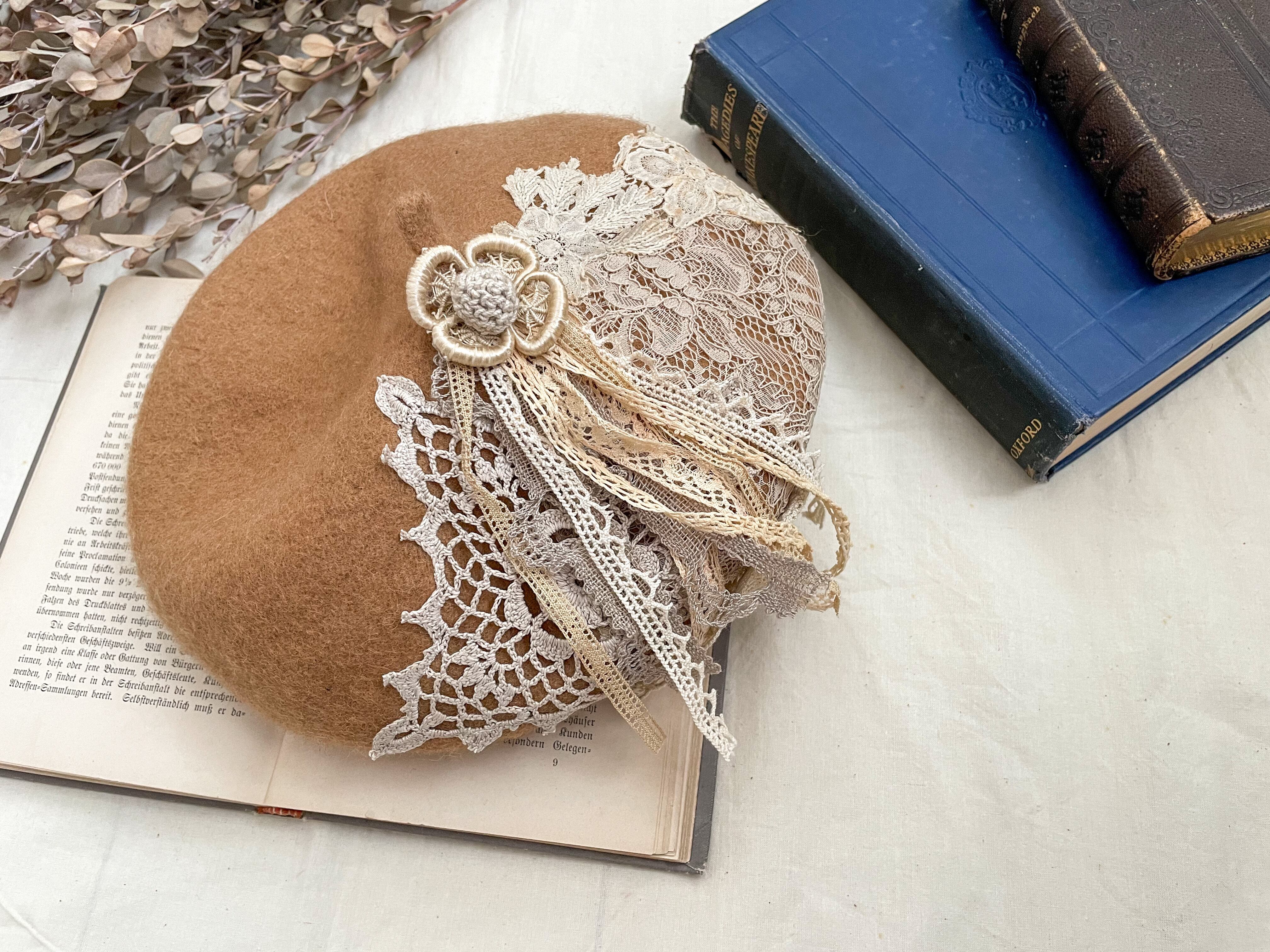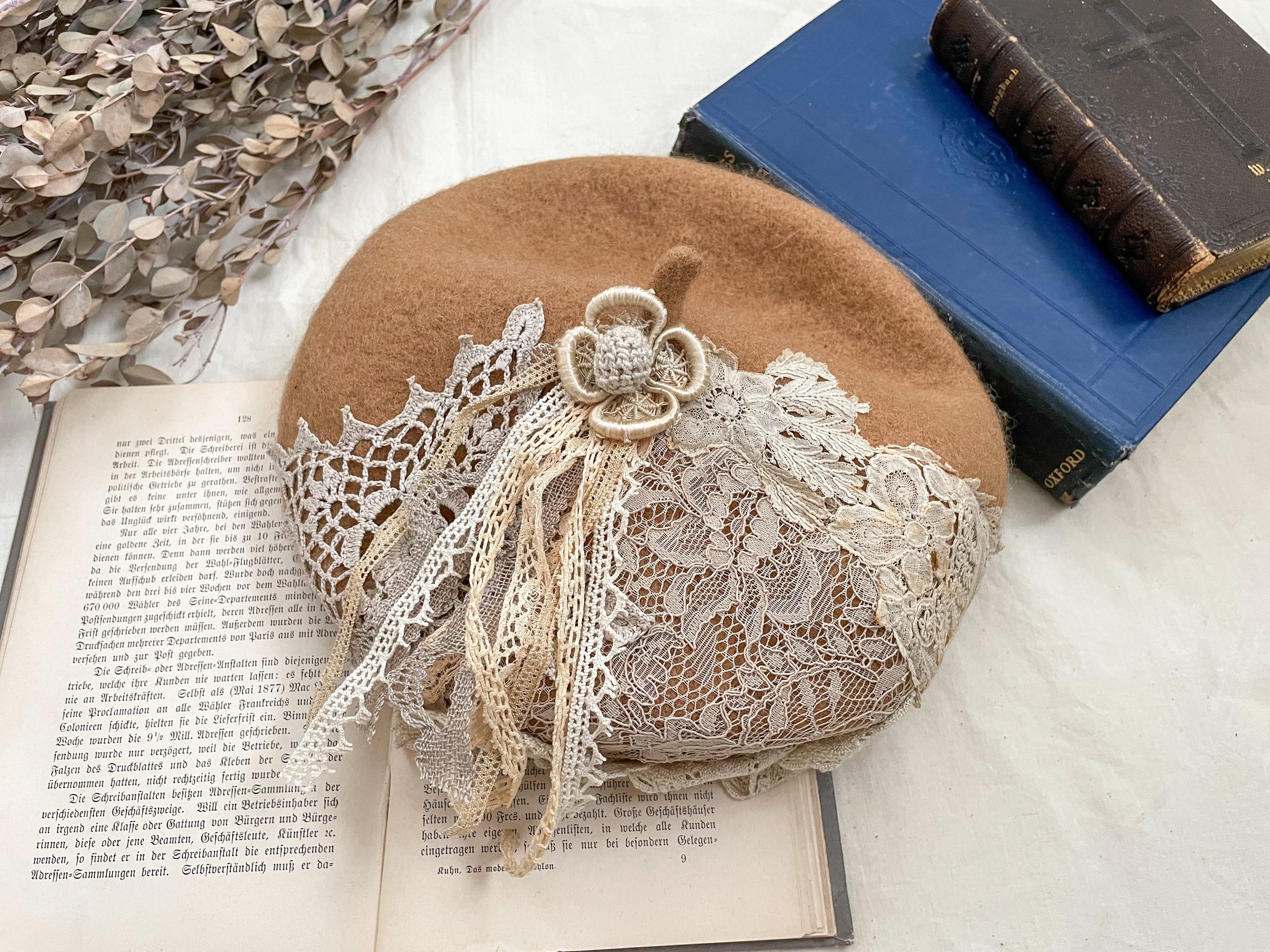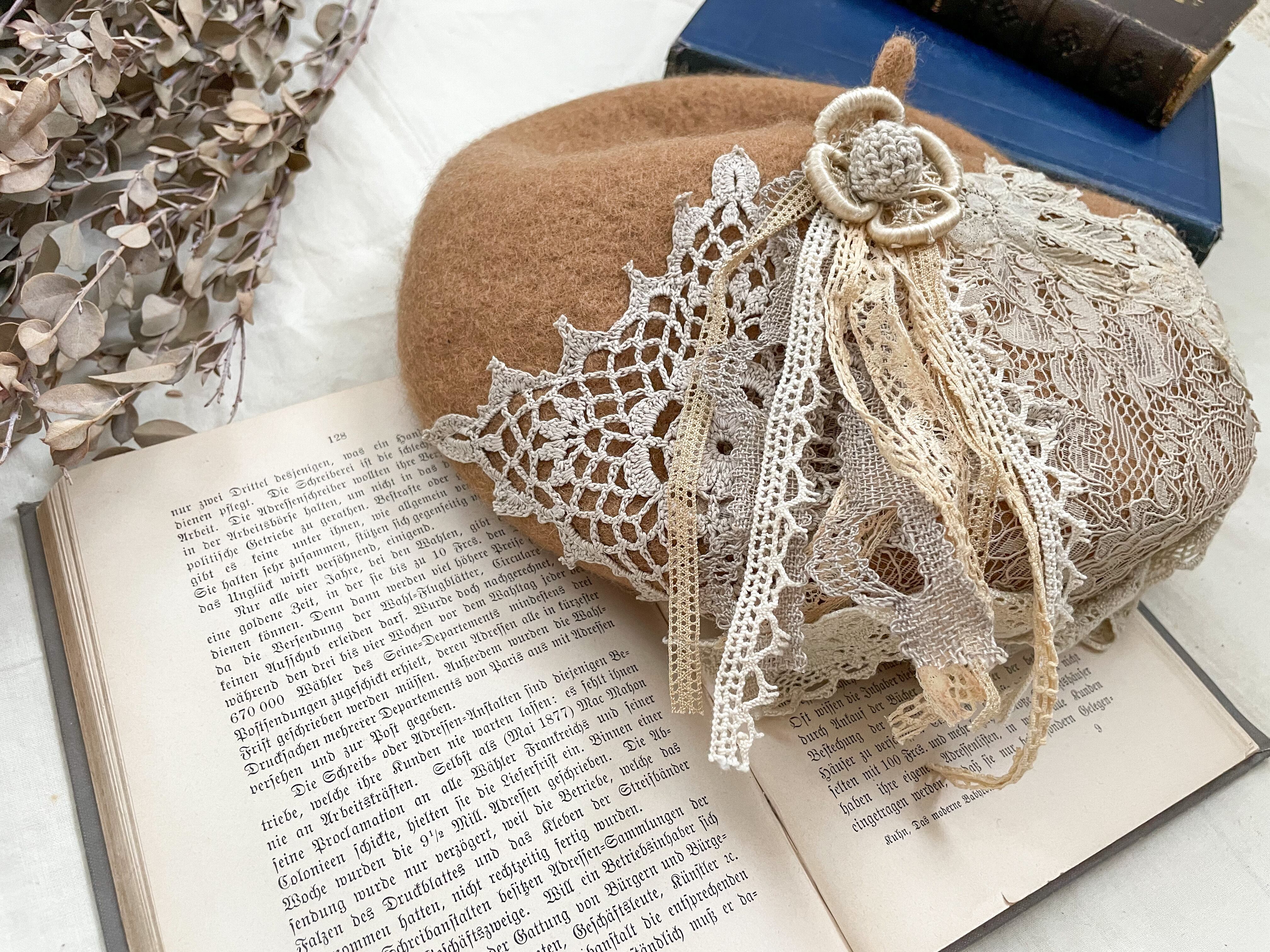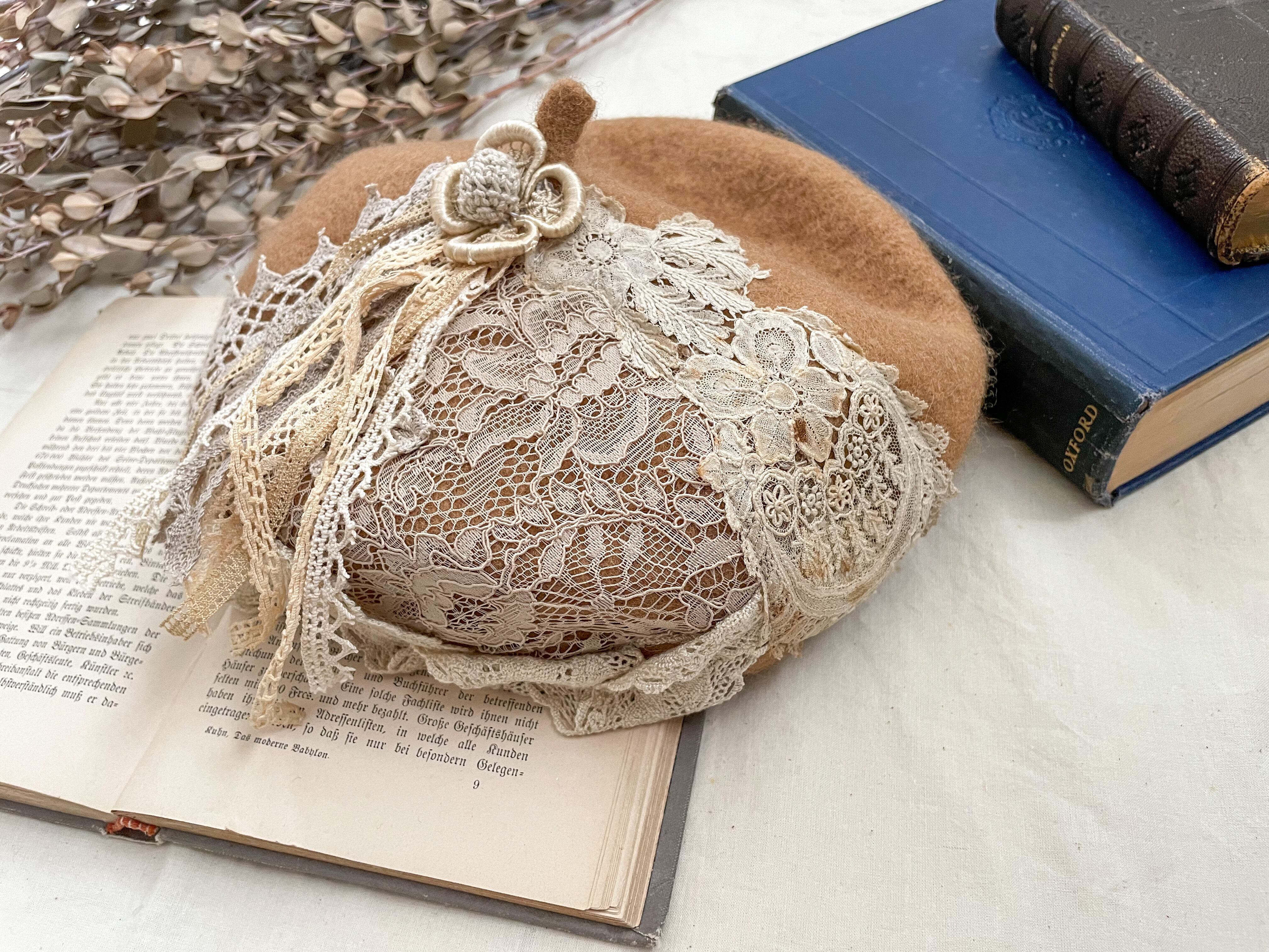 アンティークレースをコラージュしたブラウンカラーのベレー帽。