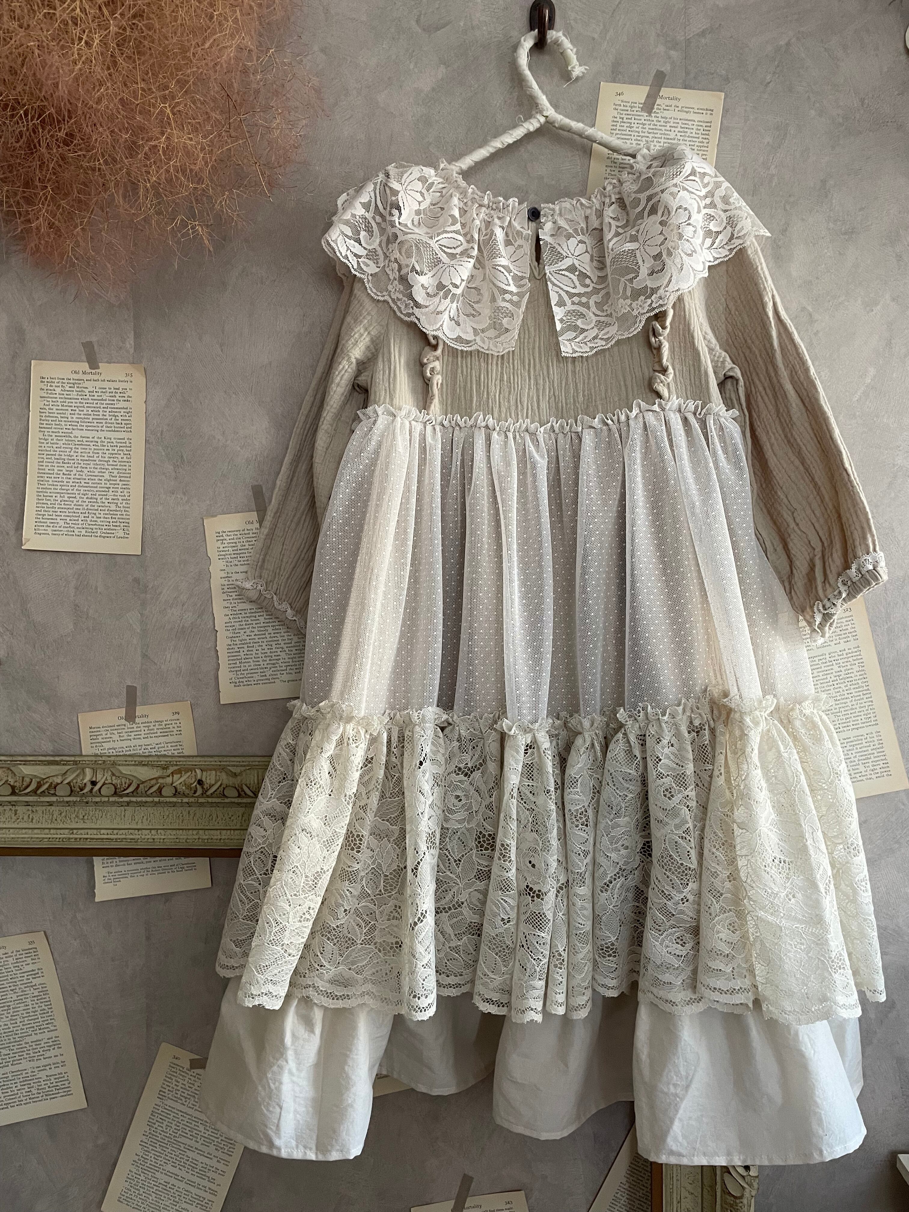 グレージュカラーのアンティークカントリーな雰囲気のリメイクワンピースです。
