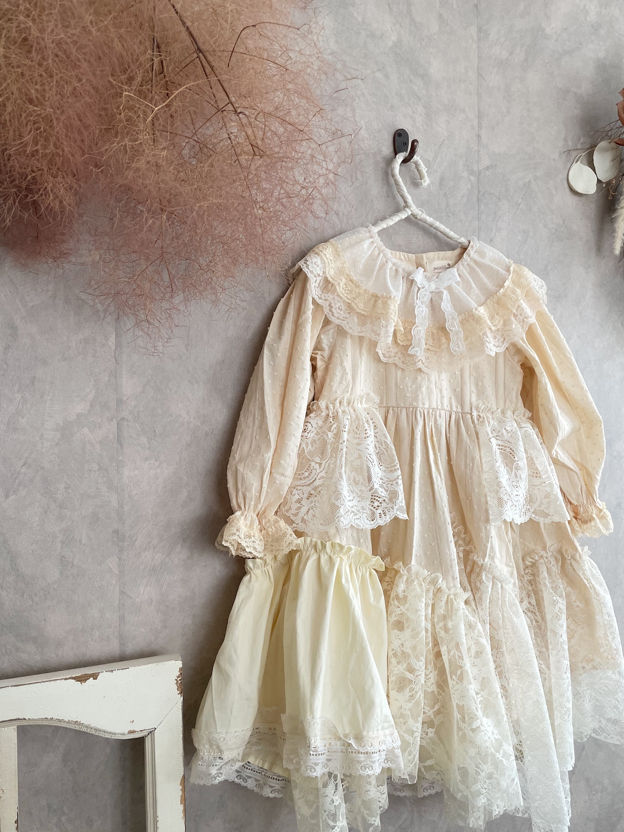 様々なレース生地にギャザーをよせてデザインしたスカートは、ふんわりと広がります。